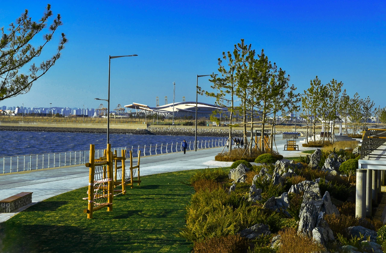 놀이를 위한 노을그네와 미끄럼틀, 바닥에 트램펄린이 마련되어 있어서 걷다가 한 번씩 펄쩍 뛰어보기도 한다. 해안 산책로엔 공원의 테라스로드와 비밀정원, 암석원, 버스킹을 할 수 있는 공연장 등이 연결되어 있어서 혼자서 걸어도 심심치 않다. 이제 막 완공되어서 앞으로 지속적인 보강이 이어질 것으로 보인다. 산책길 끄트머리 너머로 인천 크루즈터미널도 보인다.