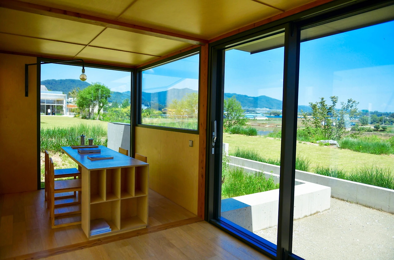 문밖으로 나오면 잔디가 깔린 너른 광장이 마음을 탁 트이게 한다. 잔디밭을 거닐거나 나무 그늘에 앉아 망중한을 보내는 이들이야말로 평화로운 전원의 그림 한 점이다. 잔디밭 저편으로 야외에 설치된 뤁스퀘어의 새로운 공간 LG스마트코티지를 관람하면 때때로 로망이던 현실이 여기 있음을 알 것이다. 작은 집 오두막이란 뜻의 코티지(Cottage)는 목가적인 시골생활에 어울리는 건축이다. 이 모든 것들이 마음 돌봄을 위한 공간이다.