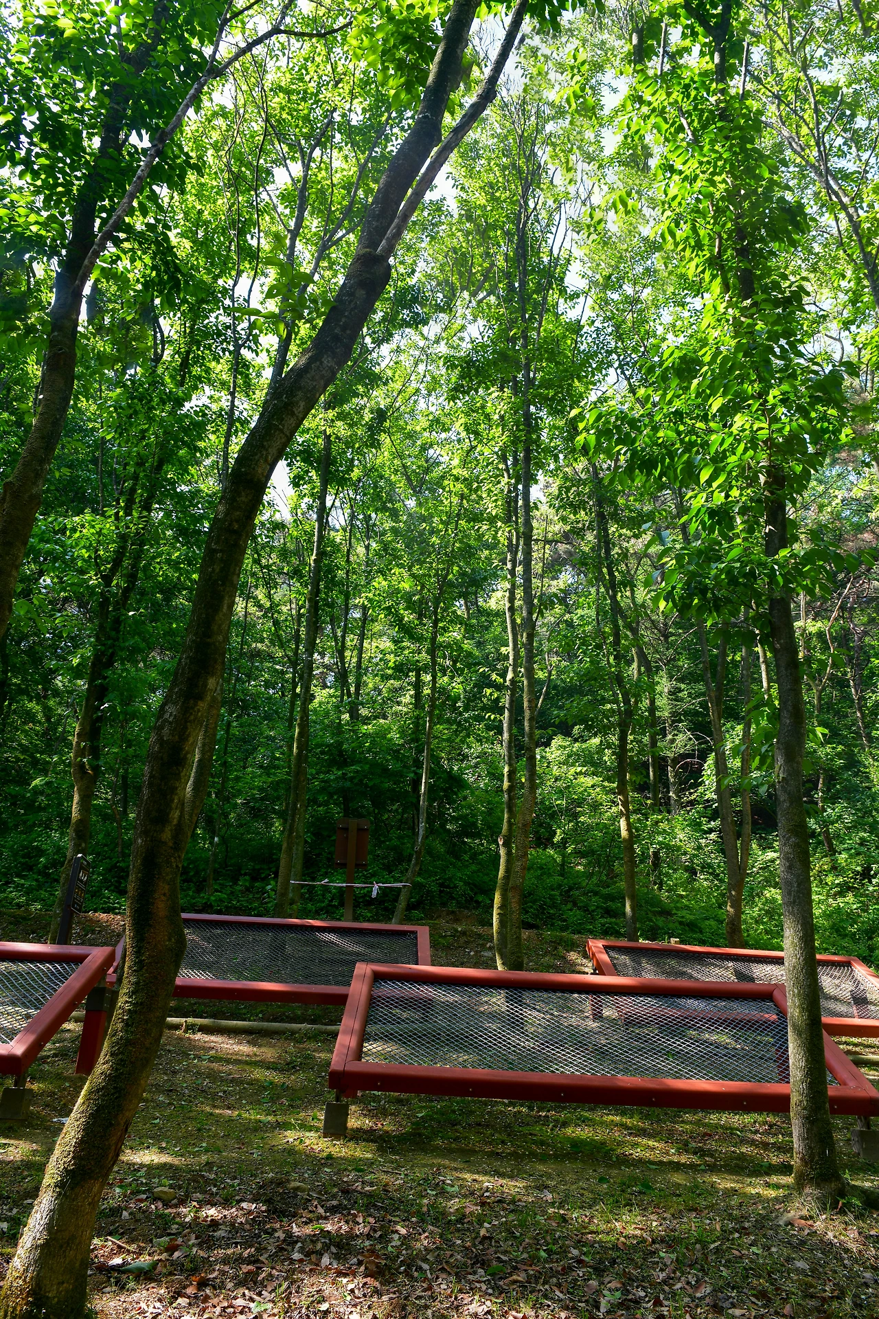걷다 보면 산길 옆으로 쉼터가 보여서 그리 힘들지 않아도 잠시 앉아 숲을 느끼는 시간을 가져보는 것도 좋다. 몇 걸음마다 네트벤치나 명상욕장이 나타나기 때문에 편하게 누워서 숲 사이로 하늘을 보며 쉬는 시간은 세상 더없는 힐링 타임이다. 탁 트이는 기분으로 오늘 이 숲은 내 거다 해볼 만하다. 네트망에 한참씩 누워있다 보면 청량한 바람소리가 들려오고 복잡한 생각도 사라지고 한없이 평온해진다. 그러다가 깜빡 잠들기도 하는 달콤한 시간이다.