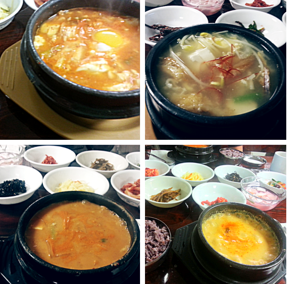 순두부 뚝배기, 황태 뚝배기, 청국장 뚝배기, 콩비지 뚝배기.