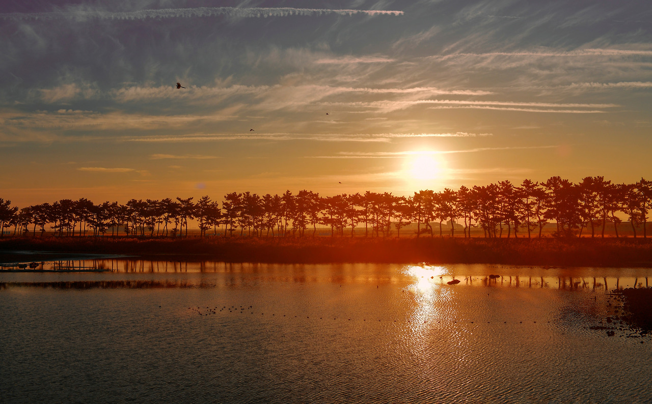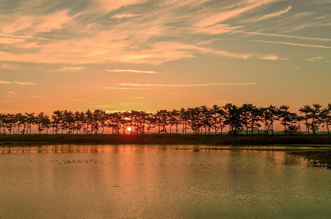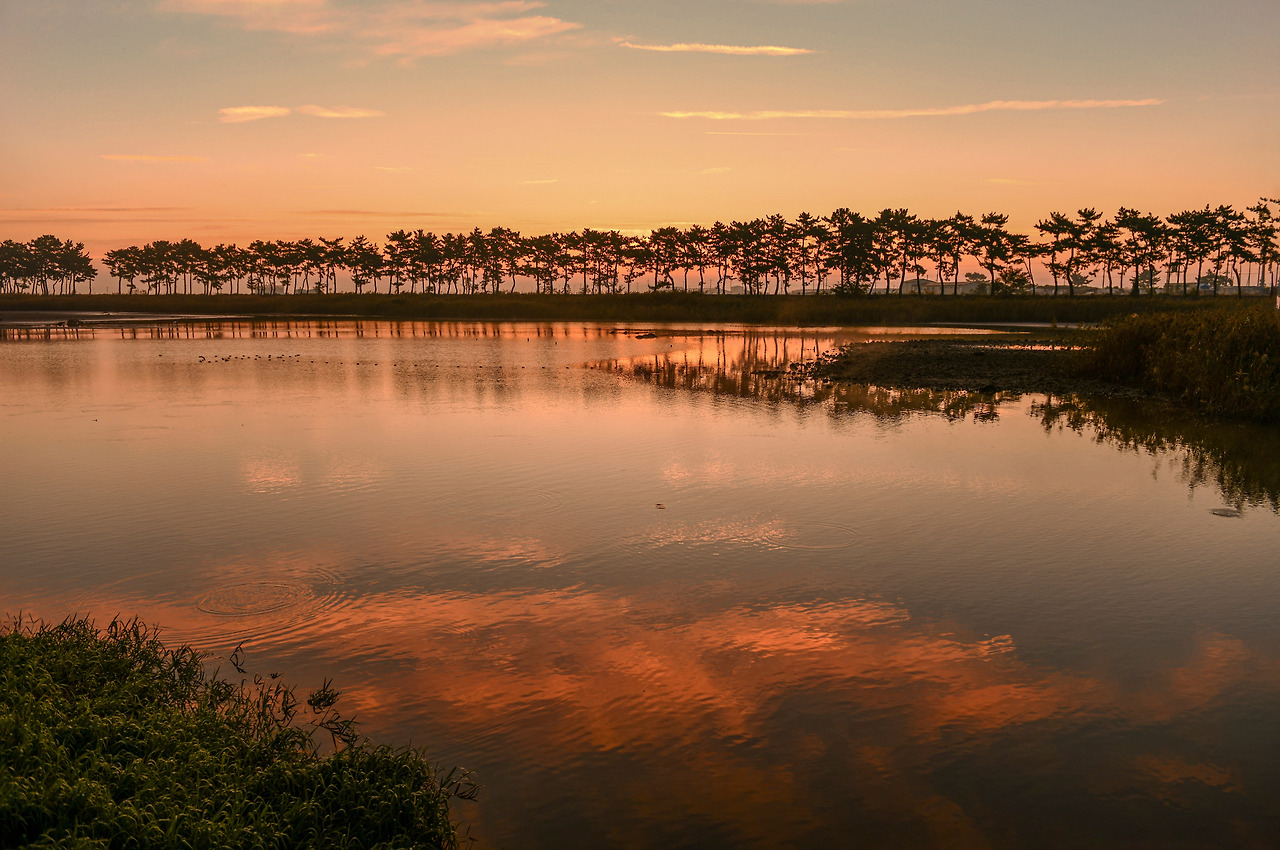 차츰 주변의 어둠이 옅어지고 이윽고 하늘 저편으로 불그스레한 기운이 번진다. 해뜨기 직전의 설렘으로 가슴이 두근거리기 시작한다. 갑자기 살짝 바람이 불면서 잔잔하던 수면에 파문을 일으킨다. 숨죽이며 정지된 시선은 생동감 있는 자연에 절로 탄성이 터진다. 짧은 순간 고요한 세상을 뒤덮은 순간의 매직이다. 단조로운 듯 반듯한 제방 위 소나무 사이를 헤치고 세상을 일깨우는 아침 해의 운치는 계화리 작은 마을에서만 볼 수 있는 풍경이다. 바다 수평선 위에서 솟아오르는 동해의 일출과는 사뭇 다르다. 그렇게 장엄한 해맞이를 하고 새로운 하루가 우리 모두에게 왔다.