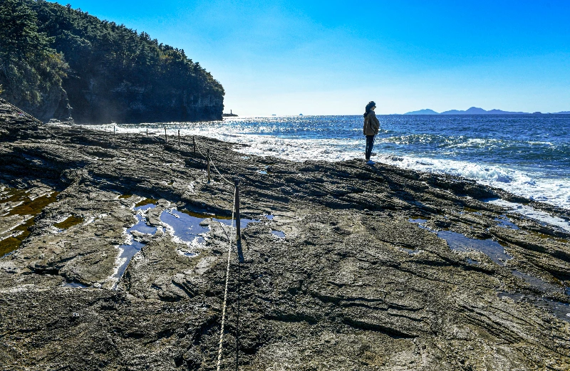 자연이 만들어온 억겁의 시간을 이야기할 때 흔히들 공룡을 떠올린다. 지질학적으로 공룡시대보다는 비교적 짧은 약 7000만 년 전부터 형성되어 온 채석강의 퇴적암이다. 지금도 암석이 보여주는 신비로운 자연 속으로 가까이 다가갈 수 있다는 점이 특별하다. 켜켜이 쌓이고 겹겹이 맞물린 퇴적암 앞에 서면 그동안 자연이 이끌어온 시간 속으로 빨려 들어간다. 변화무쌍한 파도의 침식을 받으며 쌓아 올린 퇴적암층을 가까이서 들여다보면서 문득 아득한 전설 속의 인물이 되는 느낌이다.