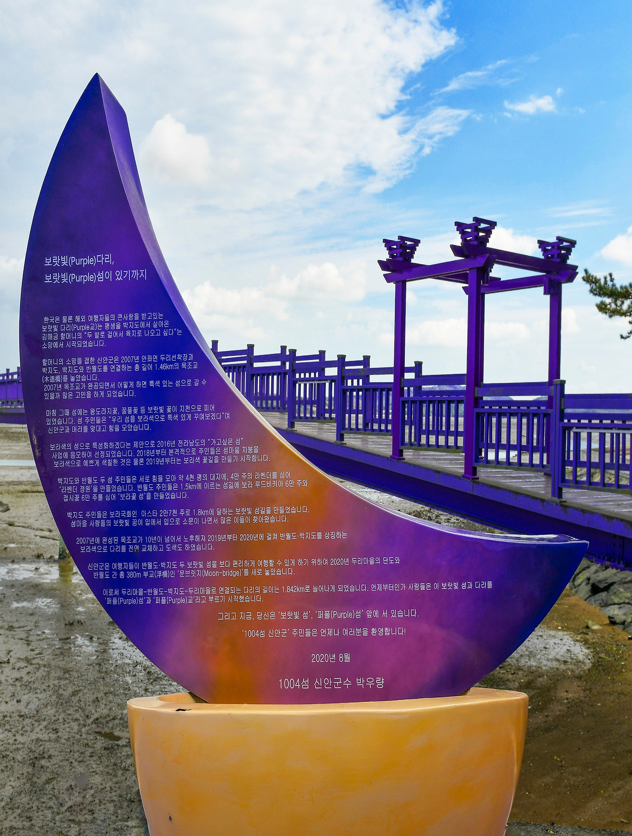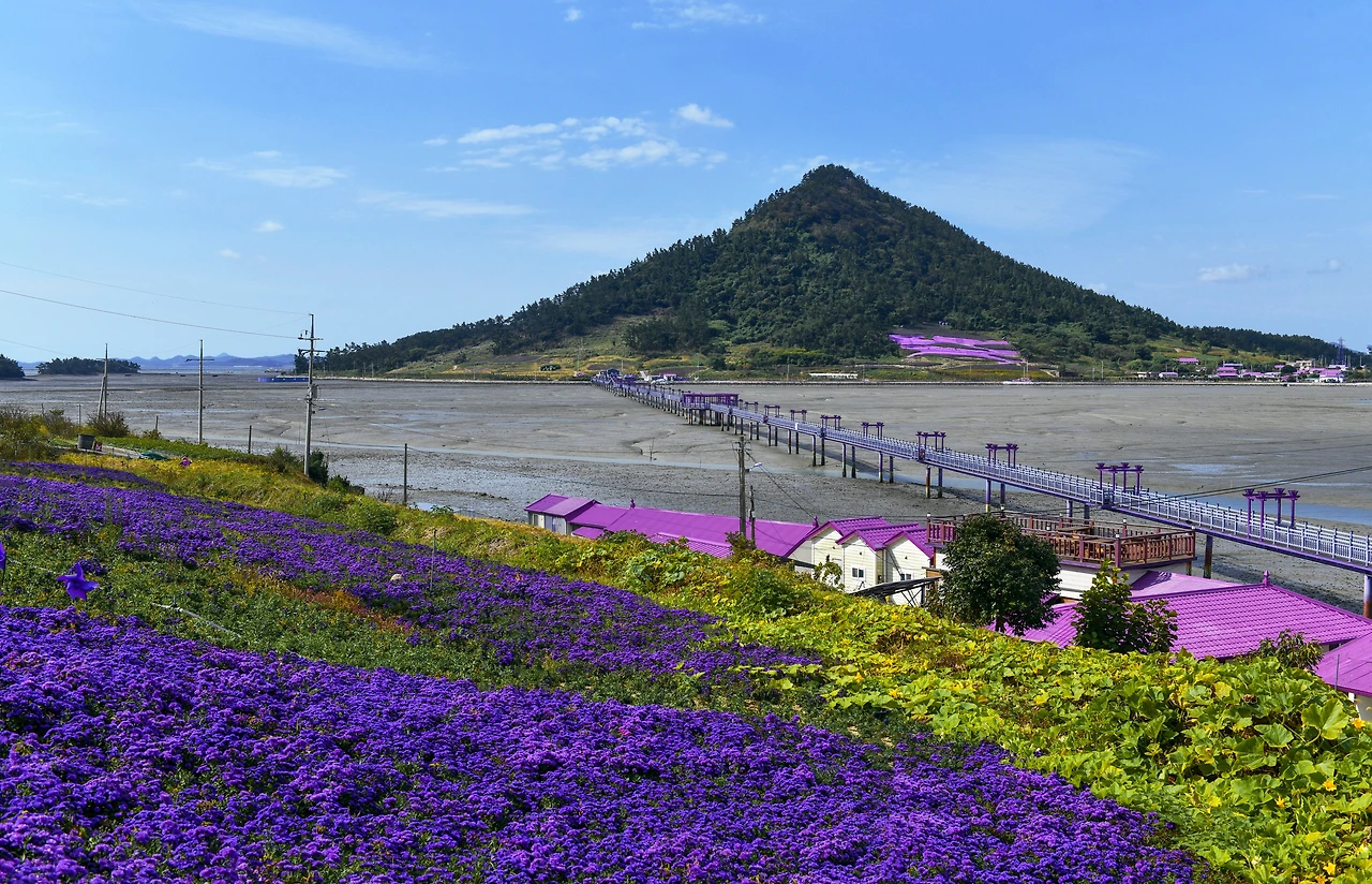 일단 길게 이어지는 목교인 퍼플교를 건너봐야 한다. 안좌도 두리마을에서 박지도까지 그리고 반월도까지 총 1,460m로 이어진 다리다. 다리를 건너면 바가지를 닮았다는 섬 박지도, 해안 산책로와 퍼플 숲길을 따라 봄과 여름이면 보랏빛 라벤더 정원이 눈부시고 가을과 겨울 초반까지는 키 작은 아스타꽃이 여행자들을 사로잡는다.