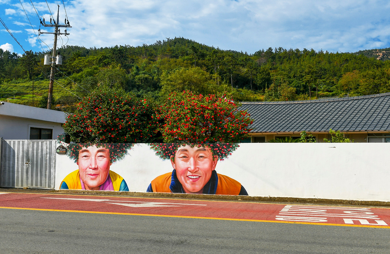무엇보다도 기동삼거리 동백꽃 파마의 노부부 벽화는 지나던 사람들의 발걸음을 멈추게 한다. 얼핏 볼 때는 파마머리를 한 노부부인데 다가가 보면 담벼락 안에서 자라는 동백나무가 절묘하게 머리 위에 얹혀 있는 모양이다. 재미있고 정겨운 벽화 덕에 천사 대교 개통과 함께 암태도 최고의 핫플레이스가 되었다. 아마 인자하고 편안한 모습이 서로 닮아 더 사람들의 마음을 끌었을 것 같다. 평생을 사이좋게 잘 살아온 노부부의 얼굴이다.