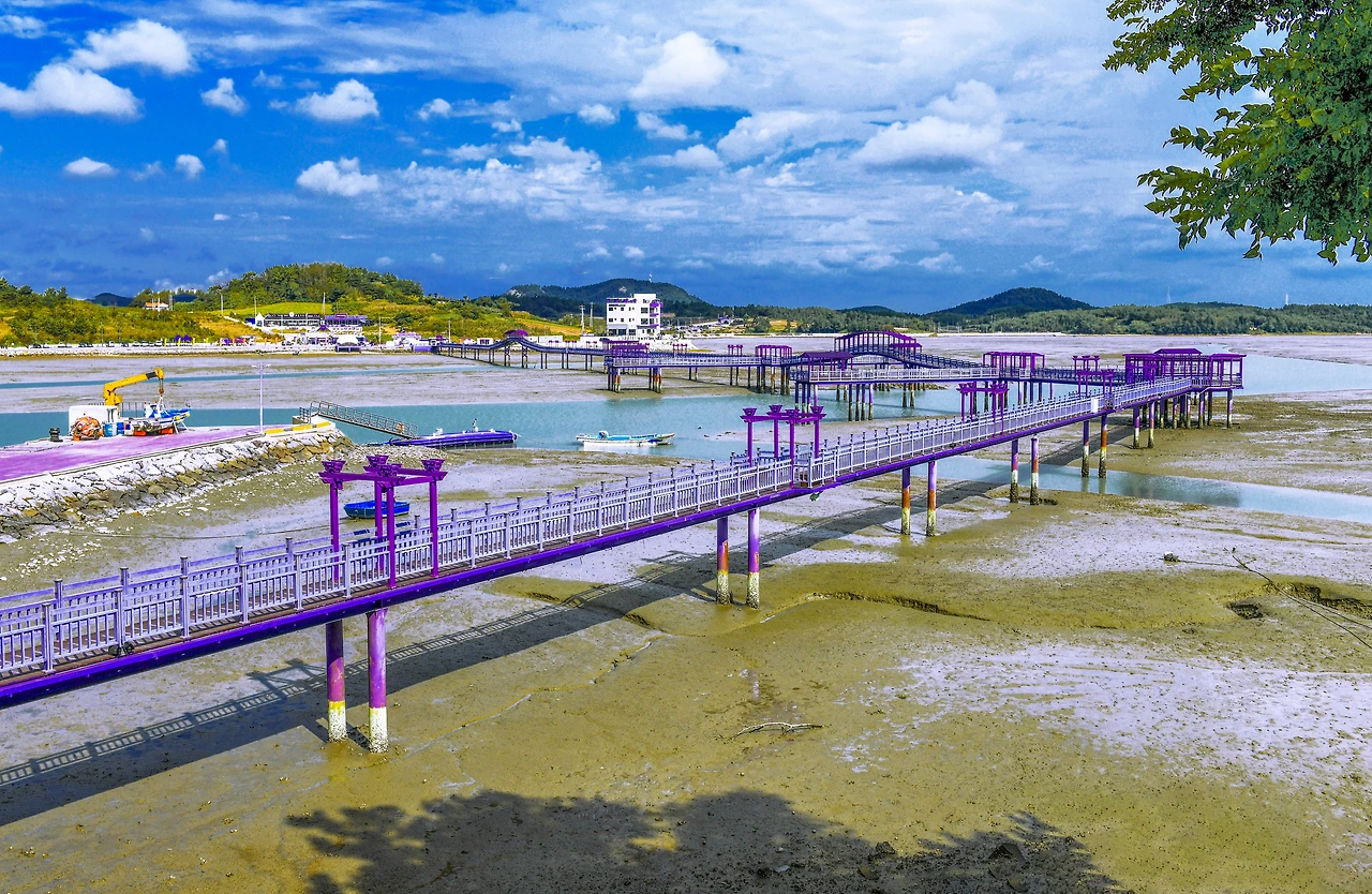 안좌도를 가장 핫한 섬으로 이끈 것은 '퍼플'이다. 안좌면의 작은 섬 박지도에 도착하니 눈앞이 온통 보랏빛이다. 할머니들이 쉬고 있는 정자의 지붕도, 표지판이나 안내 광고판도, 공중전화 부스도, 동네 길의 바닥도, 물 위에 떠 있던 작은 배와 섬 쓰레기를 버리는 차량까지 모두 보라색이다. 정말 동화 속 같은 퍼플 섬이다.