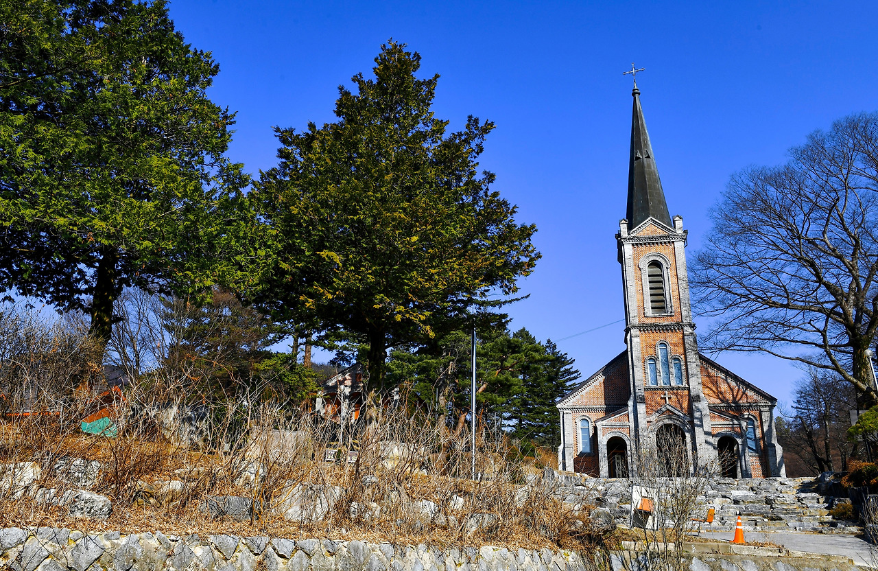 여행 중 한 군데쯤 힐링 포인트를 생각한다면 사찰이나 성지 방문이 있다. 원주 시내에서 자동차로 30분 남짓 거리에 외따로이 서 있는 용소막 성당은 언덕 위 느티나무에 에워싸인 채 고즈넉하다. 강원도에서 횡성의 풍수원 성당, 원주 성당(현 원동 주교좌) 다음으로 세 번째로 설립된 용소막 성당은 ‘신들의 숲’이라는 신림면(神林面)에 자리 잡고 있다. 강원도의 유형문화재 106호 지정되었다.