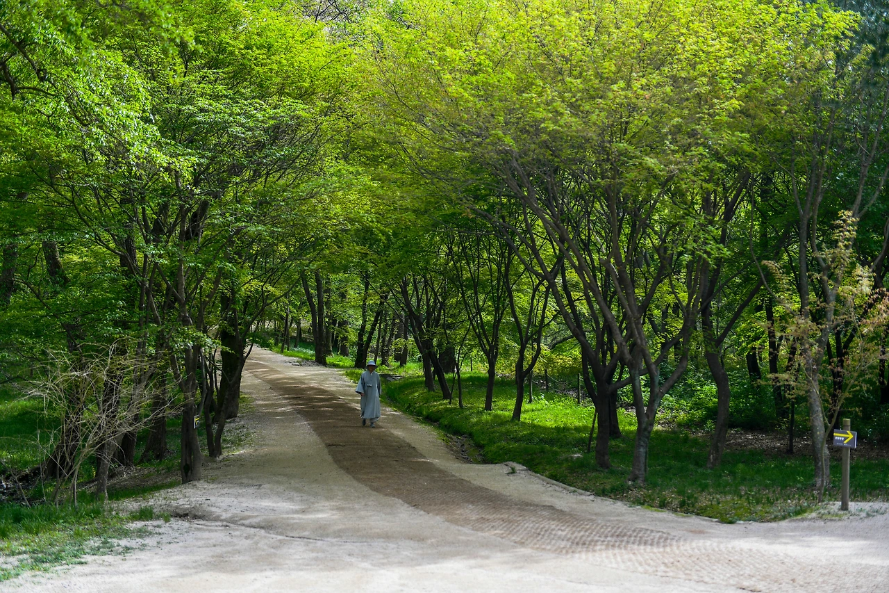 벚꽃과 진달래꽃의 반영이 예쁘던 김포 장릉 연못에 이제는 오래된 나무들이 연둣빛으로 연지에 비친다. 김포 장릉은 조선 제16대 인조의 부모인 추존 원종과 왕비 인헌왕후 구 씨의 능이다. 이곳은 특이하게도 입장 시간이 아침 7시부터여서 이른 시간부터 관람이 가능하다. 역사 속의 장소라 하지만 우리 일상에서 찾아가 차분히 힐링을 얻는 공간으로도 더할 나위 없다. 봄이면 목련과 벚꽃이 눈부시다. 초록으로 울창한 여름을 지나 가을엔 오래된 숲의 위로가 마음을 토닥인다. 긴 세월을 담은 수목들 사이를 아무리 걸어도 지루하지 않다.