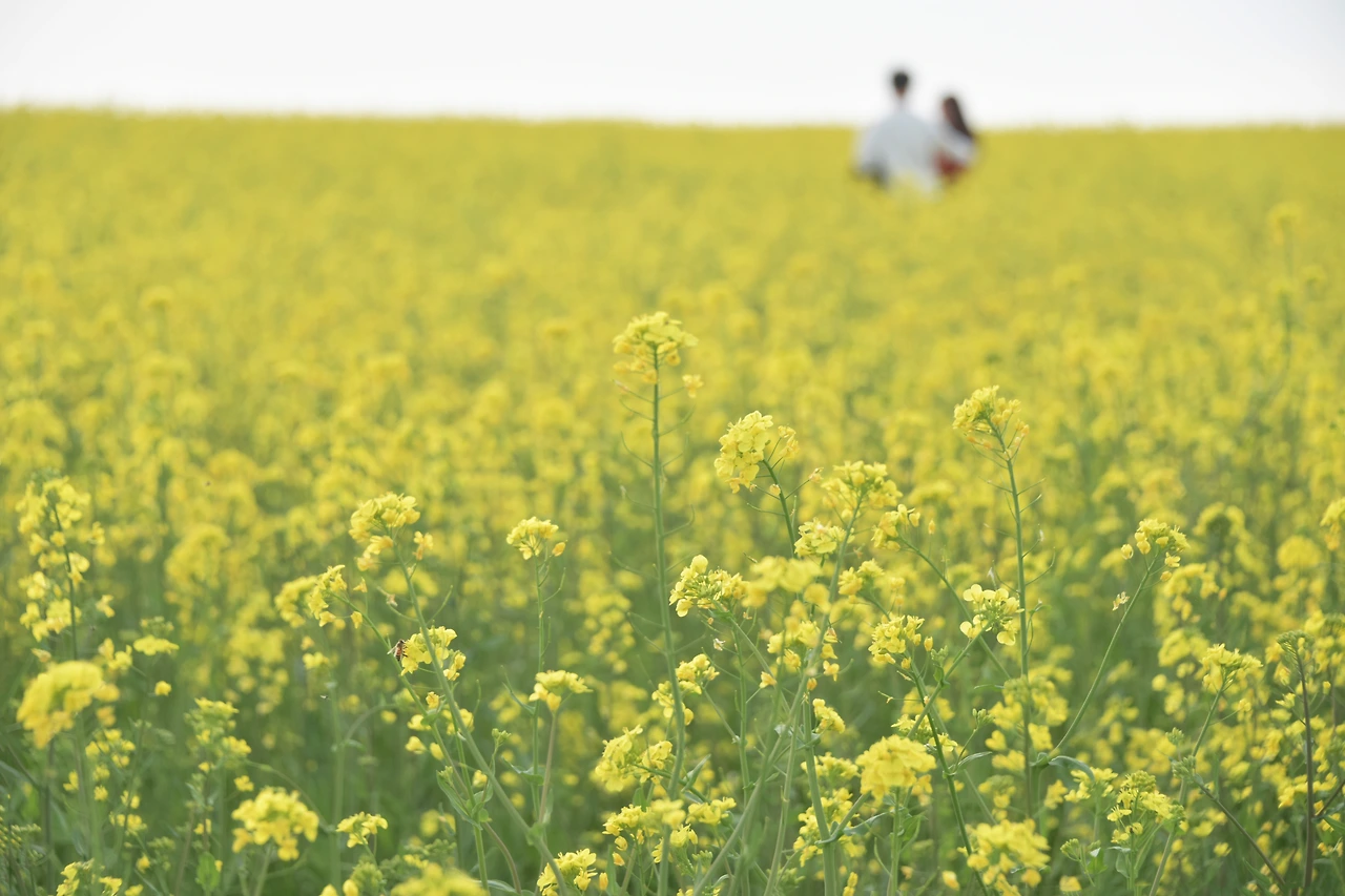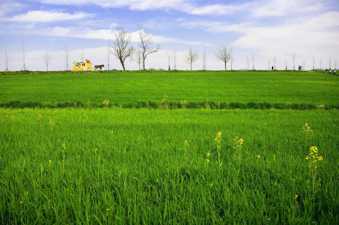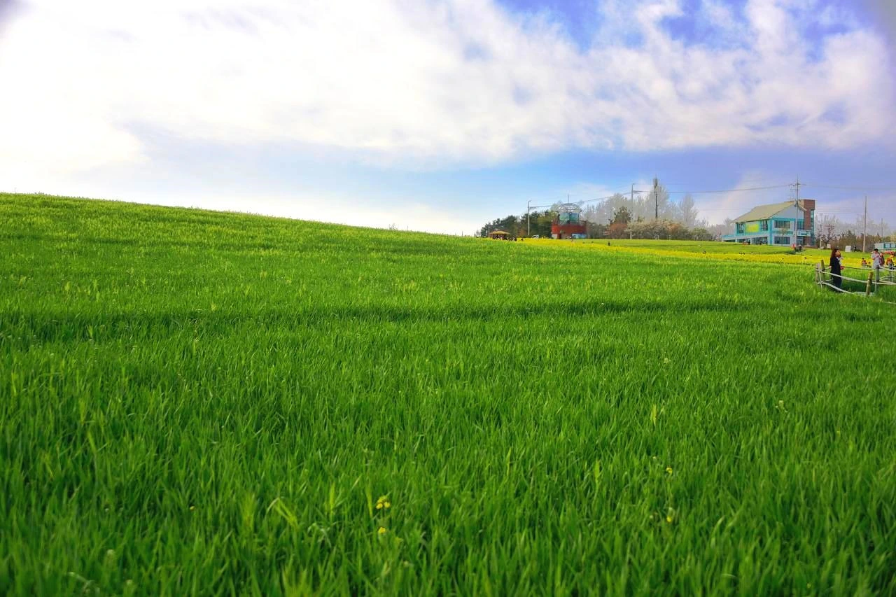 보리밭과 유채밭이 봄 하늘 아래 펼쳐져 있고 그곳을 즐기는 사람들은 행복함이다.