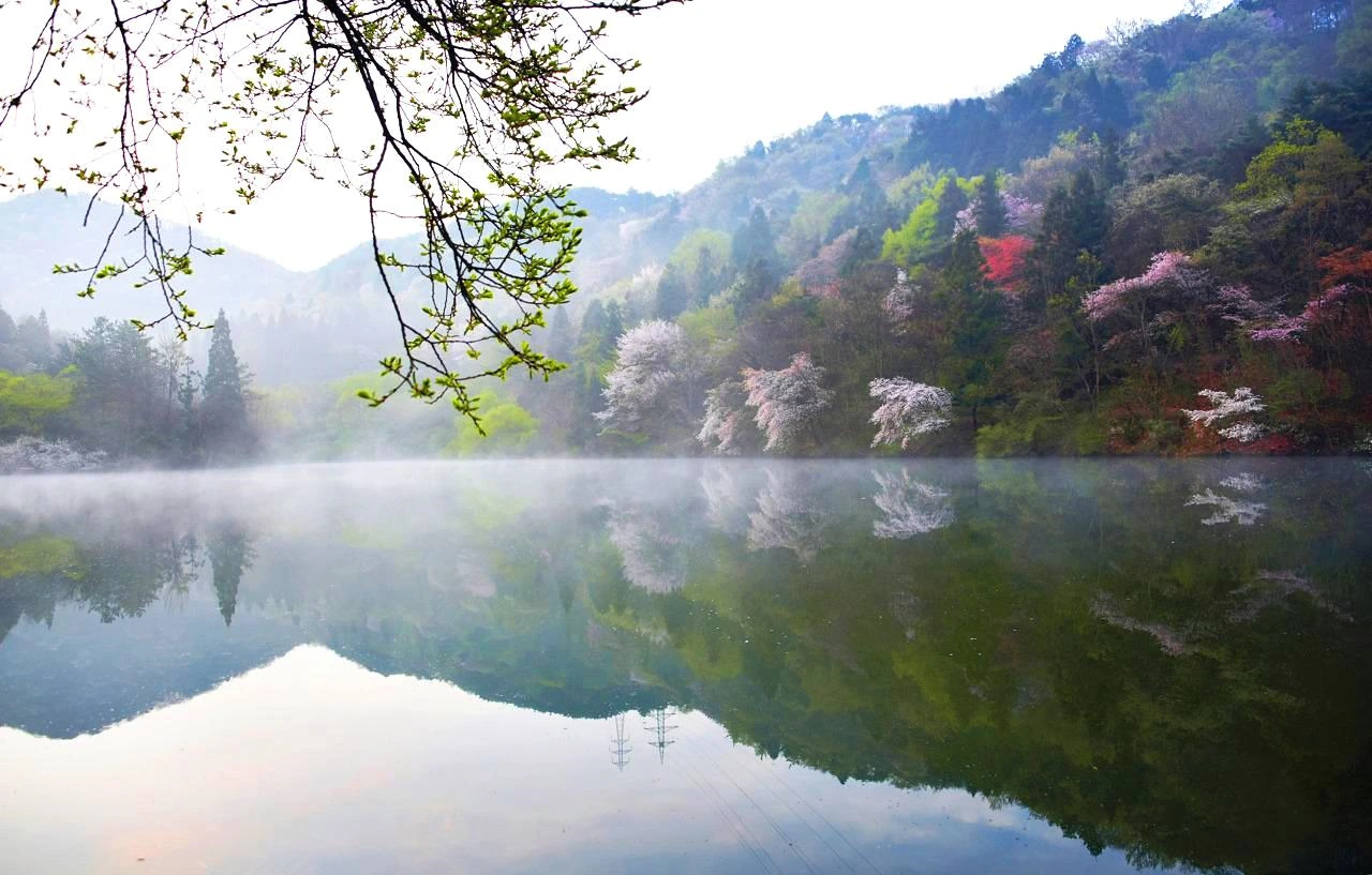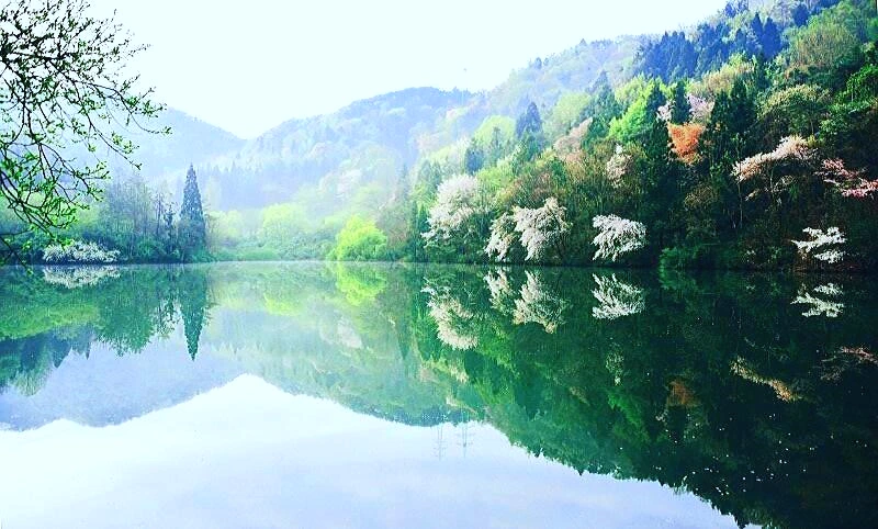 산벚꽃과 복사꽃이 물안개와 함께 이루어내는 반영이 신비롭다.