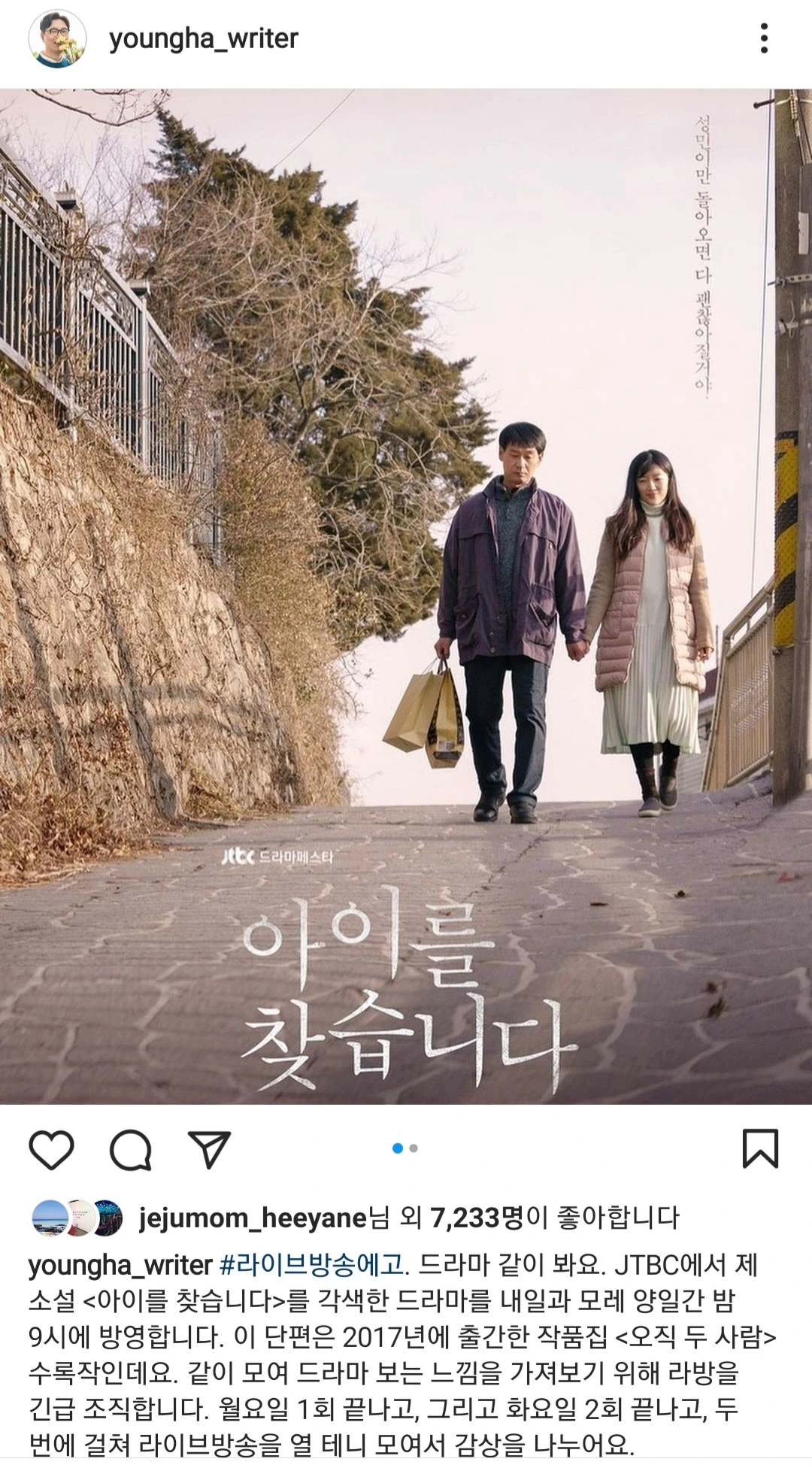 - 아까 잠깐 TV에서 "아이를 찾습니다."(김영하 원작) 드라마를 하는데 재밌더라. 내일 또 저녁 9시에 나온다던데_2부작이라 꼭 챙겨서 봐야지.