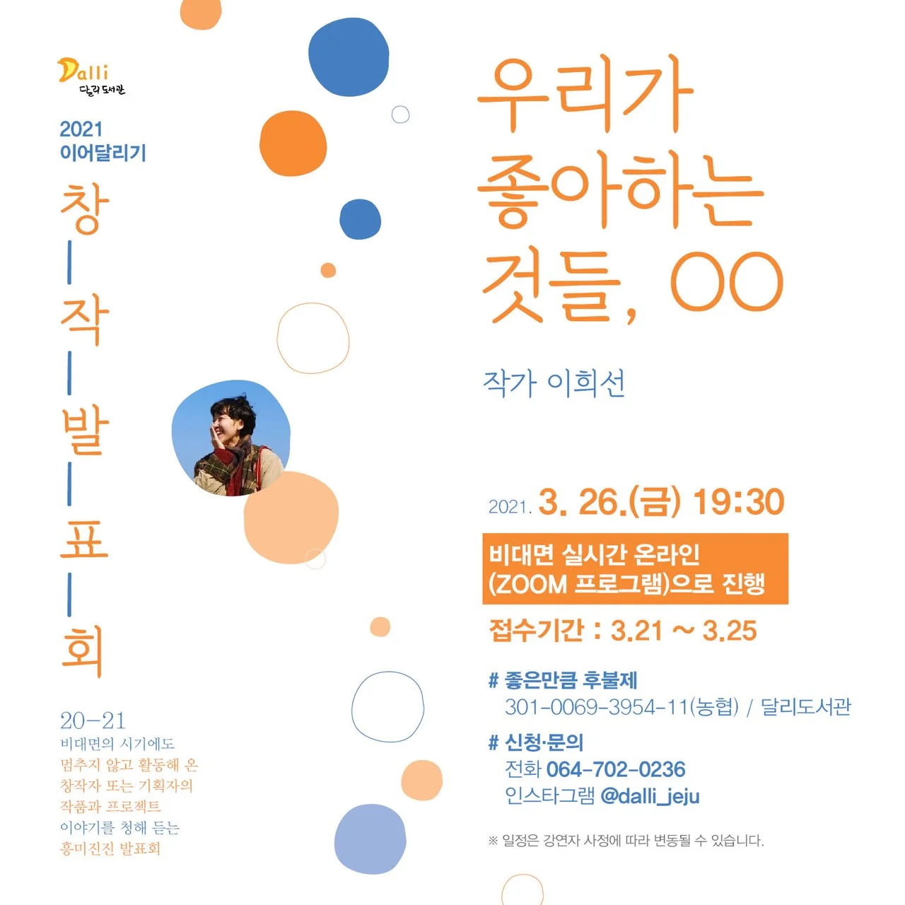 - 이번 주 금요일에 작은 도서관에서 열리는 북 토크 사전 인터뷰가 오늘 있었다. 달리도서관이라고 제주에 작은 도서관이지만 커리큘럼이 엄청 알차고 관장님과 지기님들의 열정이 공공도서관에 비할바가 안 되는 것 같았다. 그런 곳에서 강연 요청이 들어오니 정말 이게 꿈인가 생시인가 싶었다. 진행자이신 수달(수요일 달리지기)님과 함께한 1시간 반 동안의 사전 인터뷰는 내가 너무나 애정 하는 카페 노형동에 "에스프레소 라운지"에서 했다. 우선 새로운 곳에 가면 긴장되고 불안증상이 심해서 내가 편안한 곳으로 정했다. 수달님은 처음 뵈었는데 어찌나 편안하던지... 처음 뵙는 분께 나만의 비밀 2가지를 언뜻 흘려버렸다. 그만큼 사람의 마음을 홀리시는 마력이... 암튼 이번 주 금요일의 강연이 성황리는 아니지만 진정성 있게 독자분들께 다가가길 바랄 뿐이다.