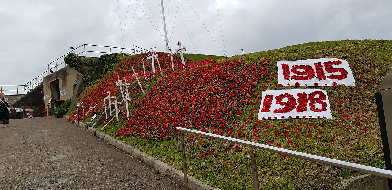 뉴카슬 전쟁기념관 앞뜰. 제1차 세계대전 전사자의 혼을 기리기 위해 양귀비꽃을 뜨개질하여 전국 각지에서 보내온 정성을 전시. 1914년을 15년으로 잘못 표기하였는데 그냥 둠.ㅎ