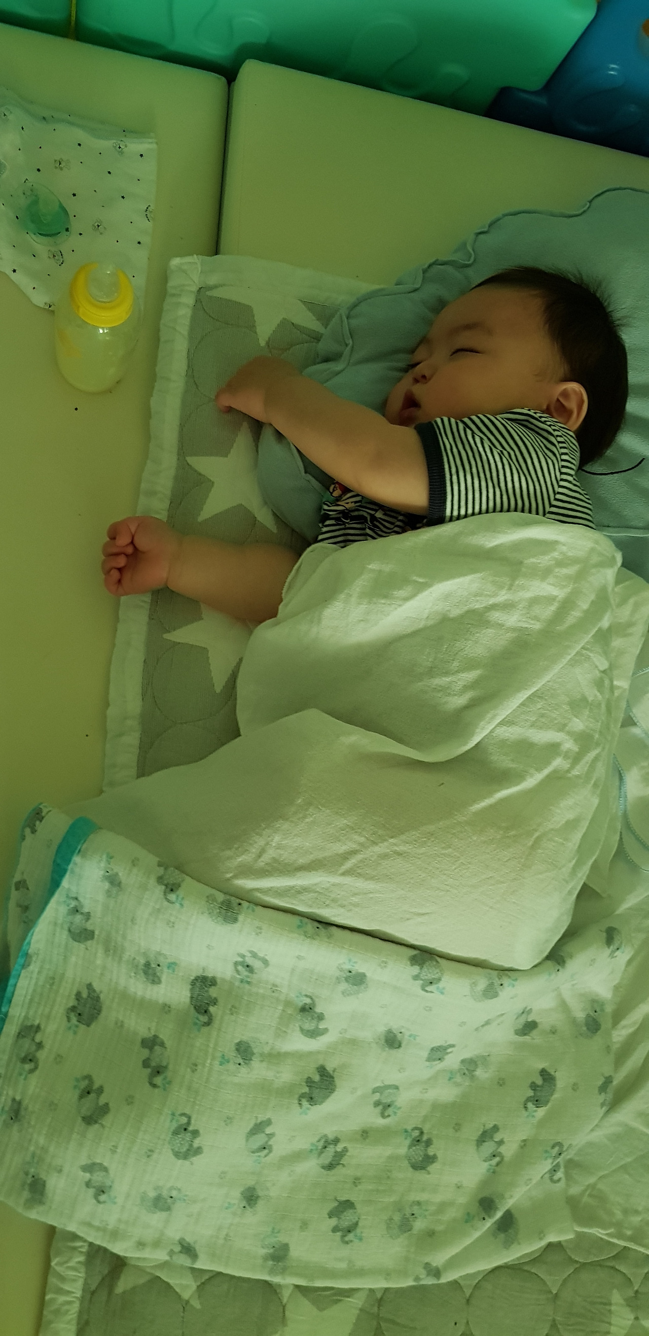 재영이도 그걸 아는 듯, 외할미가 누워있는데 슬금슬금 기어 와서 할미 팔을 베고 눕더니 또 자기가 먼저 토닥토닥한다. 그러다 230밀리 우유 한 통 거뜬히 다 먹고 코~잔다.