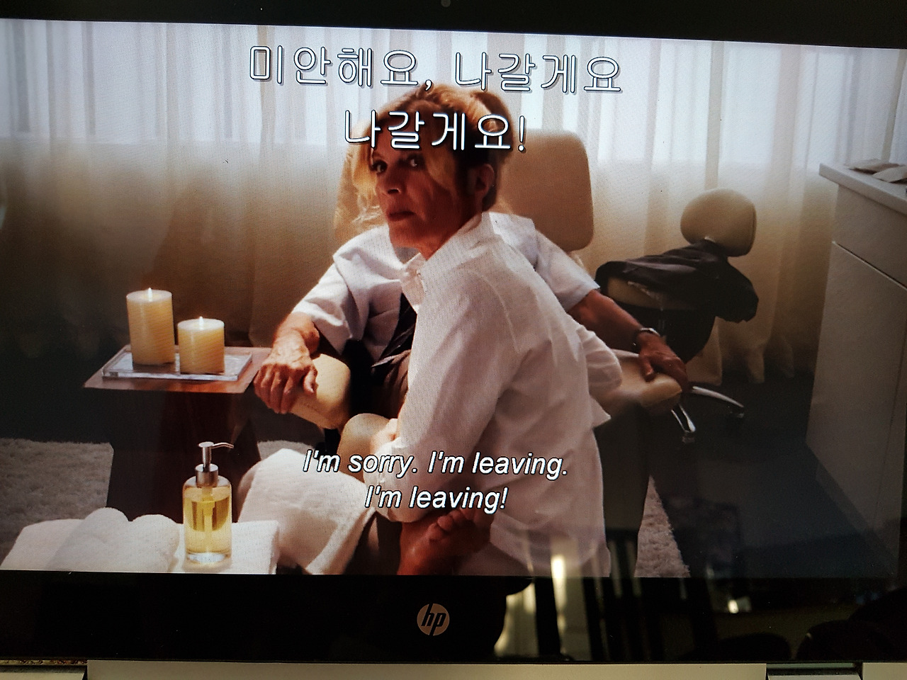 피오나 : 물론이죠. 앉으세요. 자킷 이리 주시고요. 1분만요. 편하게요. 발마사지 어때요?