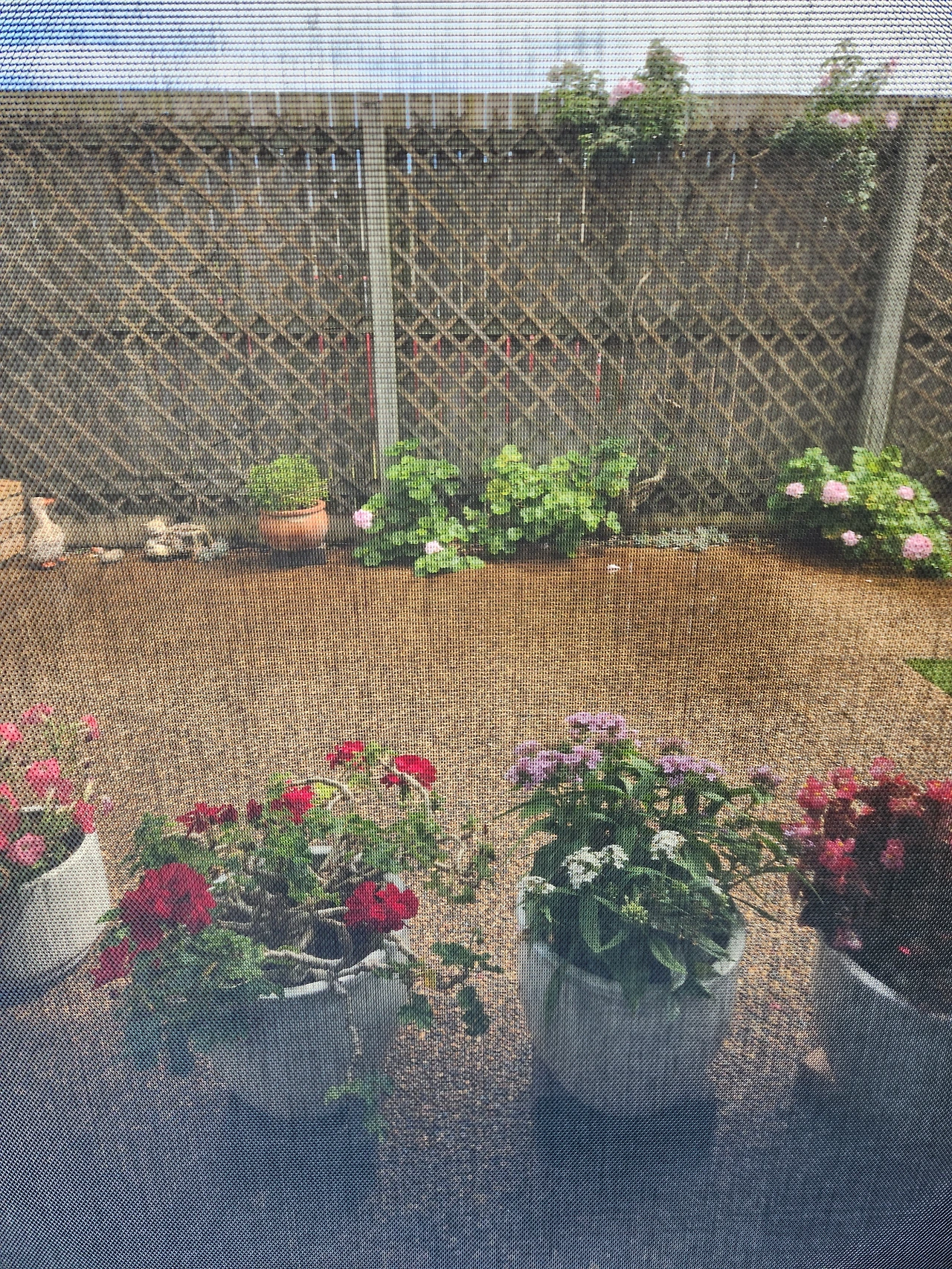 이 그물 망사 바로 너머엔 내가 심은 들꽃들이 자란다. 잔잔한 노랑꽃, 작고 이쁜 하양 꽃, 핏빛처럼 붉은 꽃들은 비바람에 살랑, 춤추듯 흔들리고 있다.