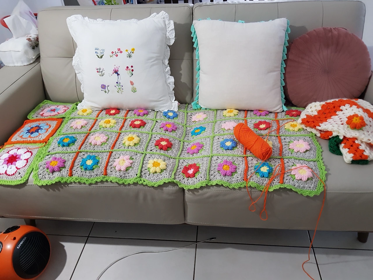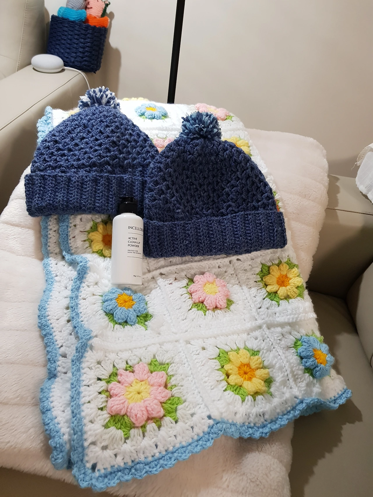 '아델 코바늘' 이라는 유투브를 보고 따라 뜬 무릎 이불, 모자, 숄. 이들은 홈리스와 병원 환우들에게 보내고 있다. 이 중 몇 가지는 나와 딸네 집 소파 위에 배치해 놓았다.