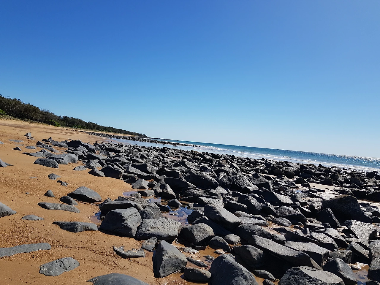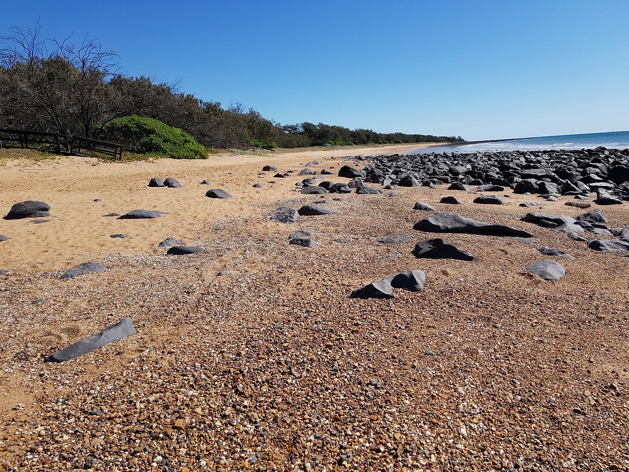 부드러운 곡선 하나로 둥글게 이루어진 해변은 자연의 품속 같이 안온하다. 인근 숲에 에워싸여 아늑하다. 썰물 때면 파도가 해변 모래사장에다 자갈 무더기들을 바다 바깥으로 쏟아놓고, 바닷물만 바다로 되쓸어 간다.