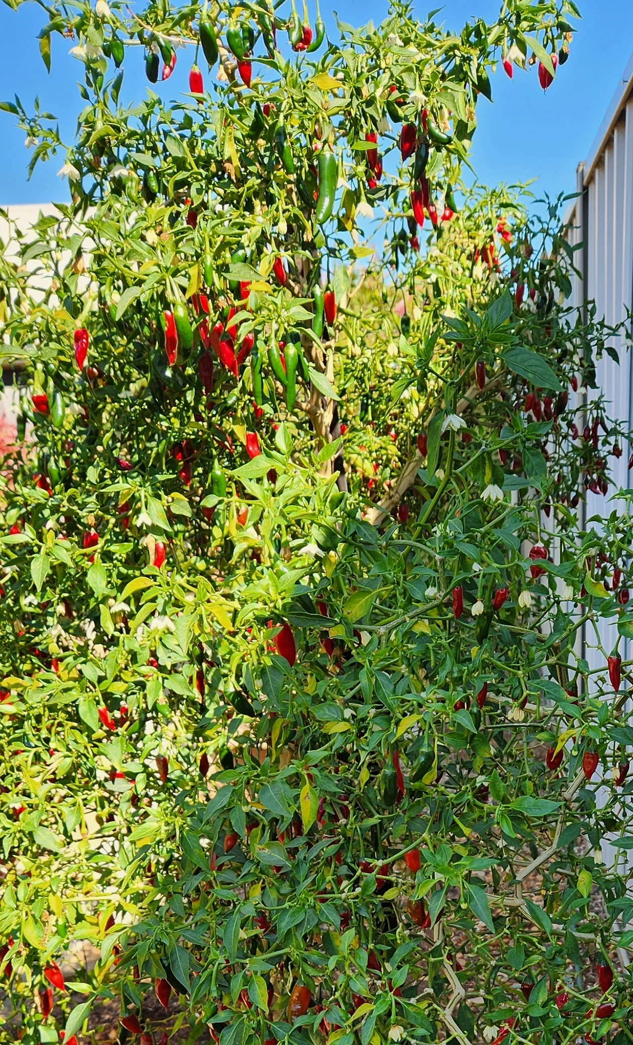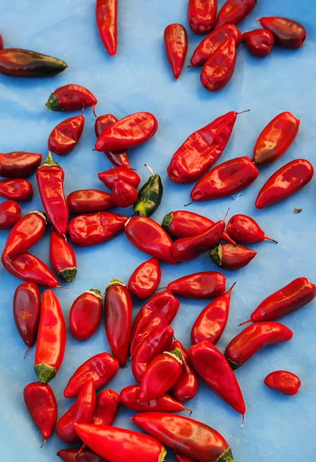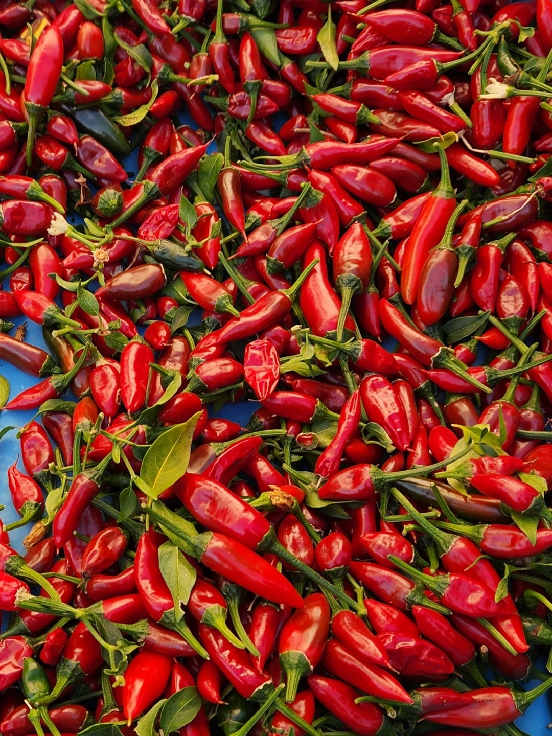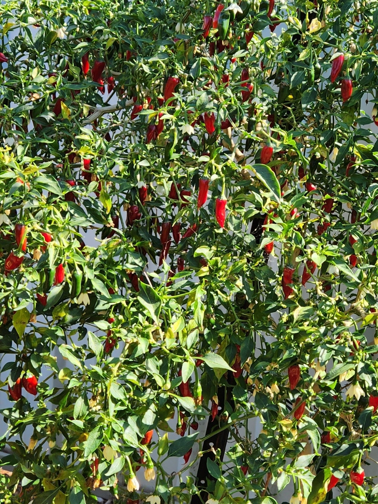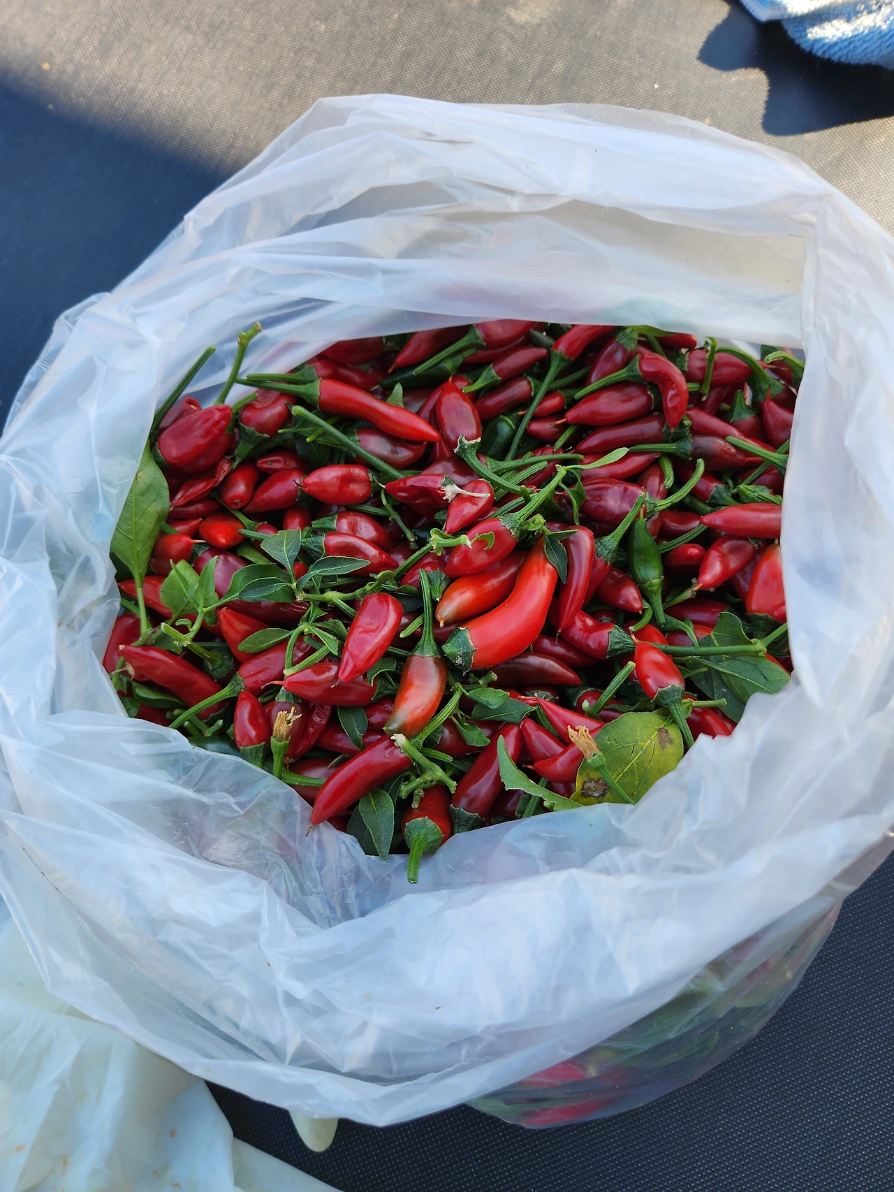 칼리 할매네 고추나무 한 그루의 붉은 자손은 청명 하늘 별마을만큼이나 총총총.. 못 셀 정도로 하고많다. 할매랑, 그 댁 딸네랑, 그 댁 이웃인 내가 돌아가며 추수했다. 캬, 대박 났다.