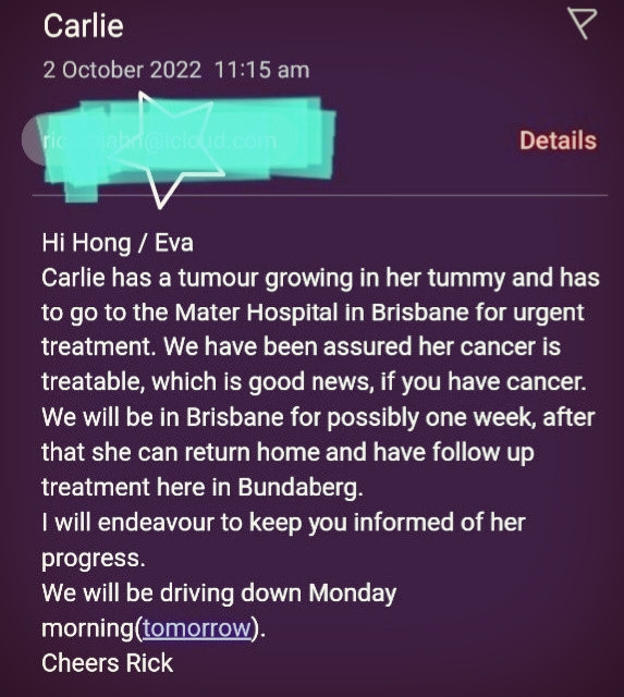 할머니의 배에 종양이 자라고 있어서 긴급 치료차 브리즈번에 급히 갈 거란다. 일주일 간 응급치료를 받고 돌아와서 이곳 병원에서 나머지를 치료받을 거라고. 그녀의 암은 치료 가능한 판정을 받았기 때문에, 릭 할아버지는 그래서 그건 반가운 뉴스라고 쓰셨다.