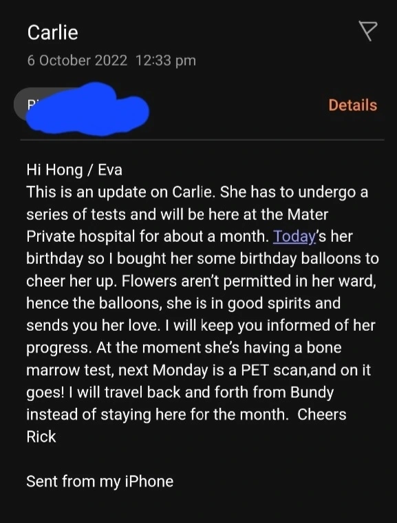 당초 계획과 달리, 할머니의 일련의 검사를 받기 위하여, 한 달간 브리즈번 병원에 더 계셔야 한단다. 오늘은 할머니의 생신이었는데 병실에 꽃은 허용되지 않으니 생일 풍선을 사드려서 격려를 해드렸다고. 그녀는 지금 기분이 좋고 우리(나와 딸)에게 그녀의 사랑을 전한다는 내용이다.
