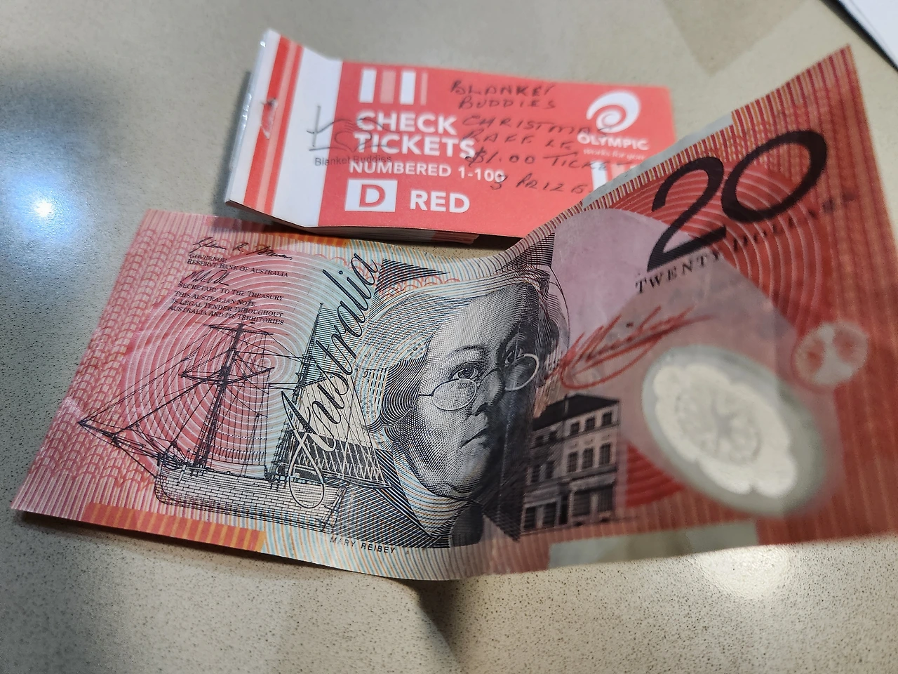 동전으로 들어온 라플 대금을 20불짜리 지폐하고 바꿔서 수요 교실의 캐럴한테 갖다 주었다.