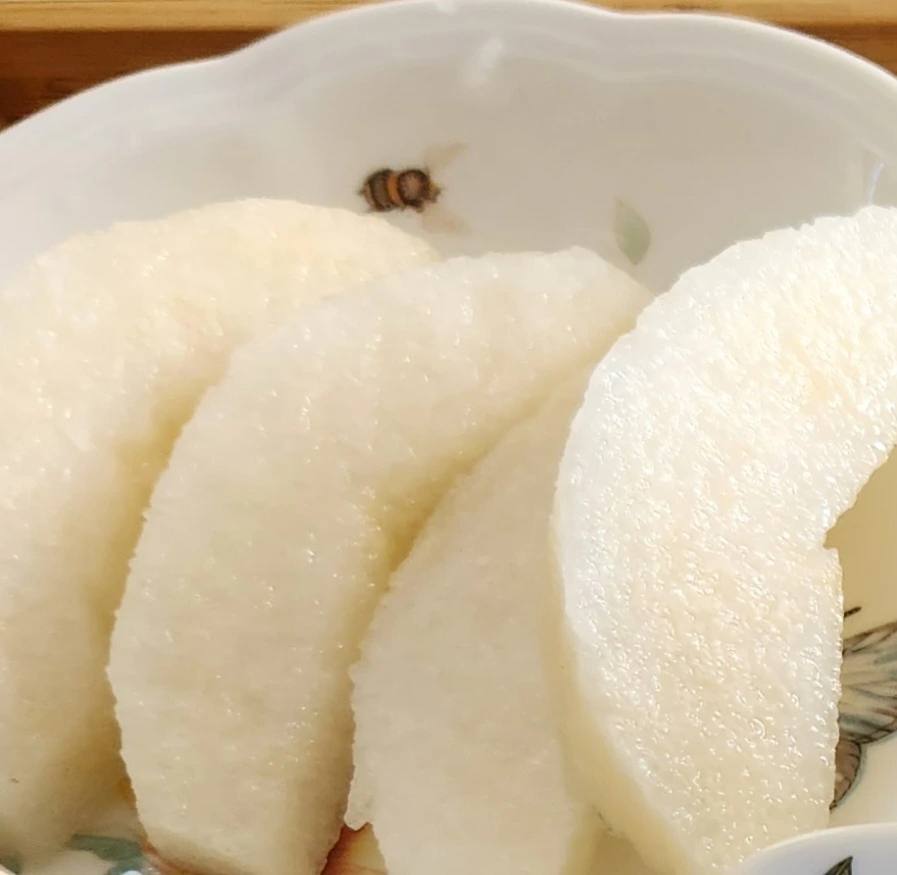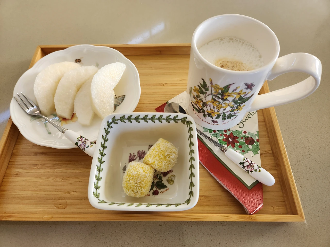 그녀가 위암 치료 중이셔서 어떤 음식을 내놓는 게 좋을까, 궁리하다가 커피를 내리고 그날 사서 냉장고에 고이 보관해 둔 신고배와 찰떡을 차려드렸다.