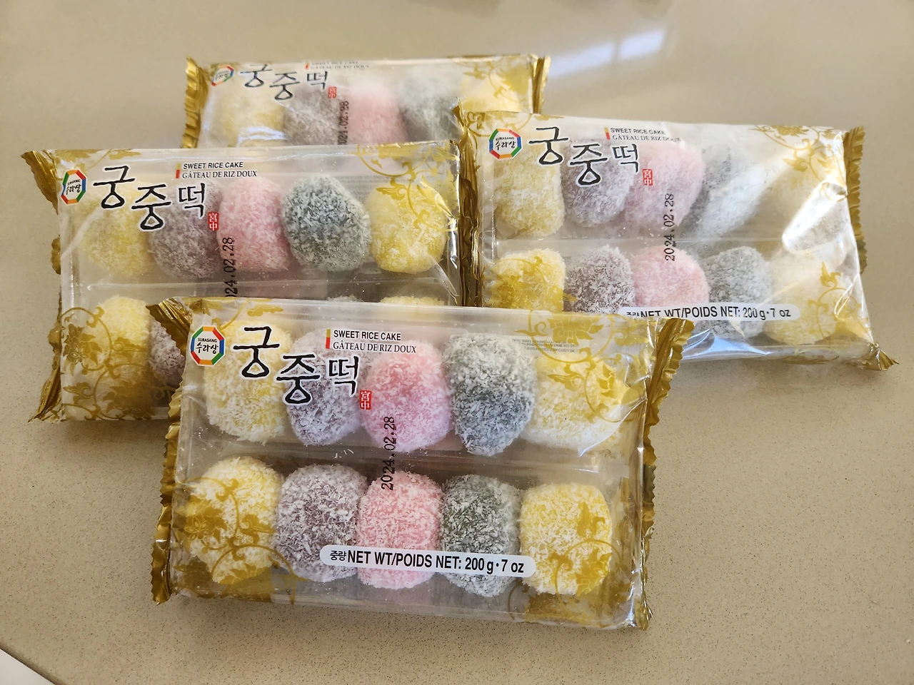 카트를 끌고 조금 더 걸어가니 떡, 반년을 기다려도 오지 않아 목 빼고 기다리던 떡의 닮은꼴이 보인다. 궁중떡이라고 쓰여있다. 내가 고대하던 떡은 아니었지만 눌러보니 말랑하고 부드러웠다. 색깔도 마음에 든다. 분홍, 노랑, 팥색, 검은색에다가 새하얀 코코넛가루를 묻혀놓았다. 이쁘다.