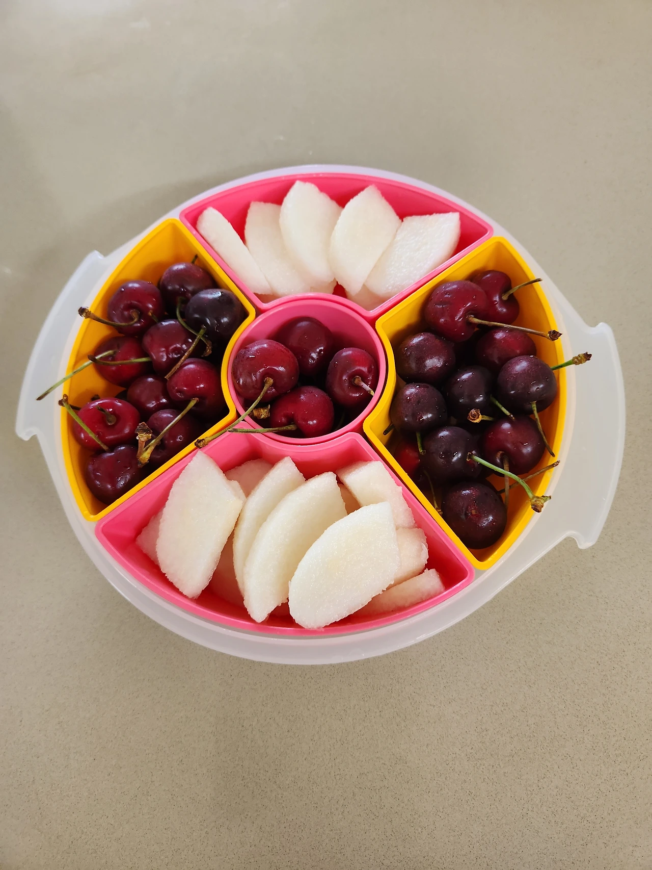 우리의 한국배, 신고배도 빨간 체리랑 있으니 더 새하얀 게, 빛이 더 났다. 반 개를 칼리 할머니네 선물로 드린 건 지금 생각해도 잘한 것 같다. 크리스마스는 나눔의 시즌이기도 하니까.