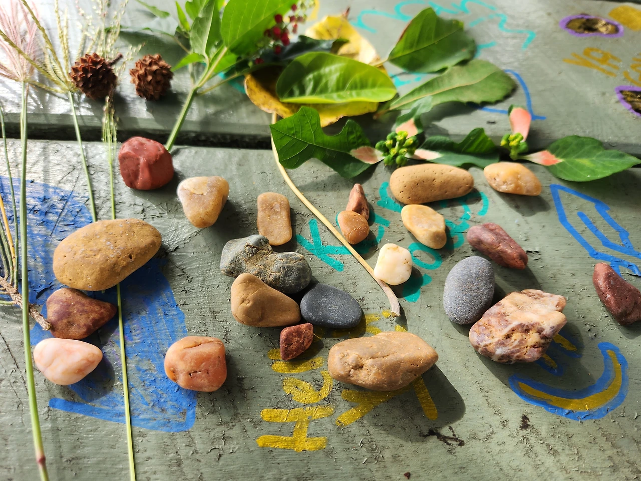 오솔길에서 모아본 잎과 돌, 그들의 공통점은 말이 없는 거였다. 자연의 색감 그대로 내면을 표현하고 있었다. 모난 데 없이 편안하였다. 세상 모든 건 부모 없이 태어난 건 없다. 하다못해 샤프펜슬 한 자루도 역사를 거슬러 올라가면 처음엔 숯검정 같은 흑연으로 시작하였다. 지금 내 손에 든 잎과 돌의 시원을 거슬러 가 보면, 나의 조상 아담과 이브보다 더 고대의 조상을 선조로 두었을 게다. 그래서 나보다 더 깊은 건가. 그래서 말없이, 단단하게 입을 꼭 다물고서도 이토록 이쁘고 부드럽게 있는가, 싶었다. 때론, 말이 없어 깊어진다.
