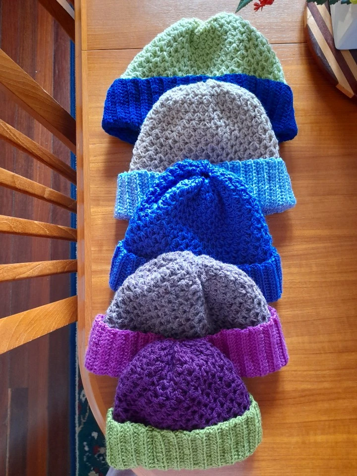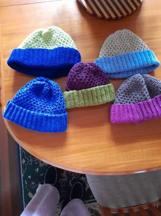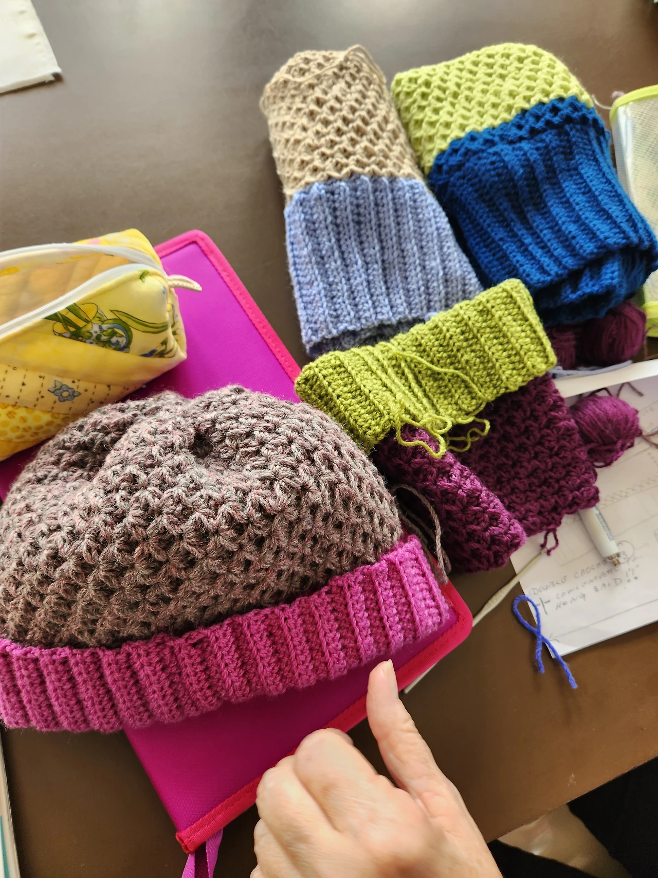 수할머니가 오늘 완성한 한국패턴 비니모자. 그리고 아직 뜨개질이 진행 중인 수할머니의 비니들.어른용이라며, 꼭대기 달랑거리는 폼폼은 안다신다고 했다.^^