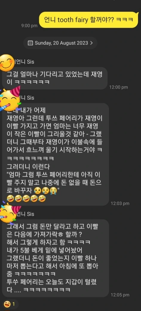 삼신할매 같은 그 이빨요정이, 한몫을 톡톡히 해주셨다. 아래 업로드한 재영이 엄마와 이모의 카톡대화를 풀어보면 이렇다. 동생이 묻는다. '언니, tooth fairy 할 거야?ㅎ' 언니가 대답한다. '그럼, 재영이가 얼마나 기다리고 있었는데. ㅎ 그런데 내가 어제, 재영아, 투쓰 페어리가 재영이 이빨 가지고 가면, 엄마는 재영이 작은 이빨이 그리울 것 같아, 그랬더니 그때부터 재영이가 이불 속에 들어가서 울기 시작하는 거야. ㅎ 그러더니 이런다, 엄마, 그럼 투쓰 페어리한테 아직 이빨 주지 말고 나중에 돈 없을 때 돈으로 바꾸자, 그래서 내가 이렇게 말했어. 그럼 돈만 달라고 하고 이빨은 다음에 가져가라고 할까? 해서 그렇게 하자고 함. ㅋ 그래서 투쓰 페어리가 베개밑에 5불을 넣어놨어. 그랬더니 돈이 좋았는지 이빨하나 마저 뽑는다고 해서, 아침에 또 뽑아줌. ㅋㅋㅋㅋㅋㅋ. 투쓰 페어리는 오늘도 지갑이 털렸다. ㅋㅋㅋㅋㅋㅋ.'
