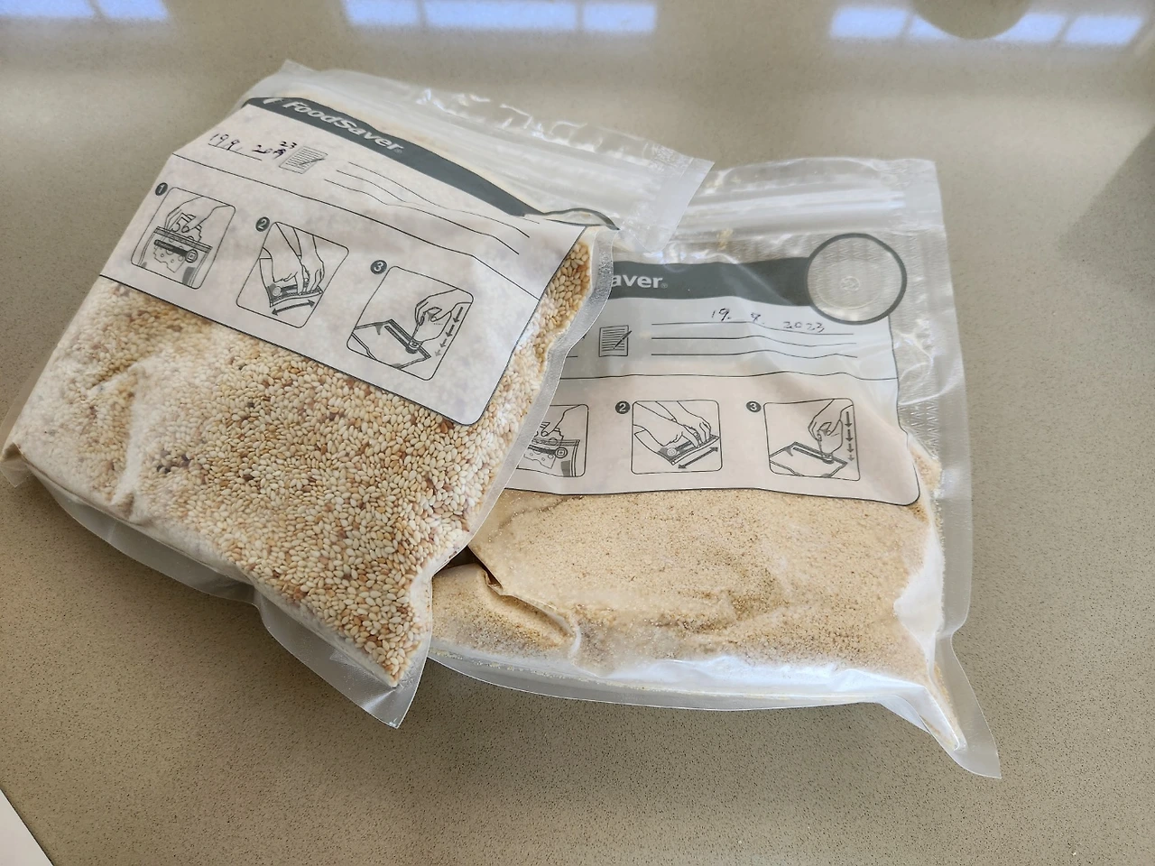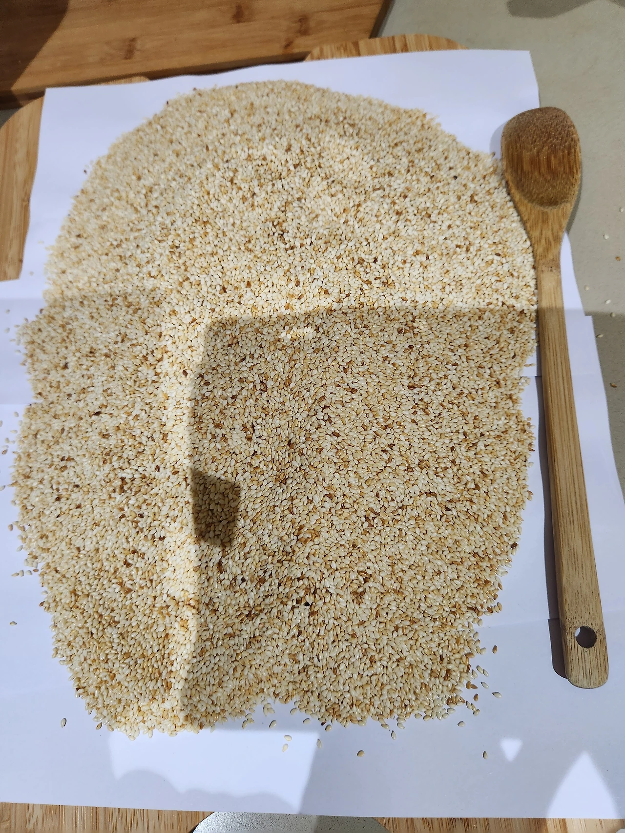 잔여불기운에서, 잘 마른 가을낙엽색이 되면 곁에 깔아 둔 하얀 종이에다 볶인 깨를 사르륵 펼쳐가며 붓는다. 십분 정도 쉬엄쉬엄 이마에 맺힌 땀을 훔치며 깨 담을 용기를 찾아오면 볶은 깨향이 천지사방 등산을 하며 맞춤하게 식는다. 그중 절반은 볶은 날짜를 기입하여 통깨로 부어 담고, 나머지 절반은 소금을 한 꼬집 넣어 부드럽게 갈아 깨소금을 만들어 담는다.