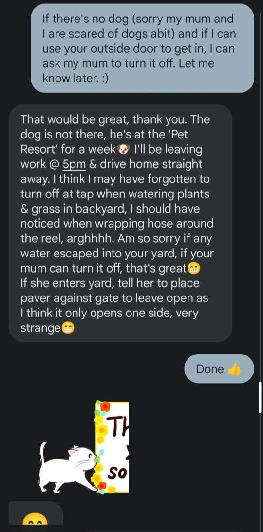 우리 엄마가 나가보니 한쪽 게이트를 밖에서 열 수 있는데, 들어가서 수도꼭지를 잠가도 되냐고 물었다. 그리고 혹시 개가 집안에 있는지도 물어보았다. 미안하지만, 우리는 개를 조금 무서워하기 때문이라고 전했다. 오후 다섯 시에 일이 끝난다는 그녀는 그래주면 정말 좋겠다고 좀 긴 문자를 보내왔다. 엄마, 그러래, 하는 딸에게 난 얼른 같이 가보자, 고 했다. 아직은 낯선 이웃의 빈집에 혼자 들어가기 내키지 않아서였다. 실내복을 입고 있던 딸은 옷을 대충 갈아입고, 옆집으로 후다닥, 나와 함께 원행?을 했다. 내가 문을 따고 딸이 뒤따라와서 게이트가 자연스럽게 쿵, 닫혔다. 그녀네 백 야드로 돌아와서 우린 물이 흥건히 고인 흙을 건너듯 밟고 물을 꼭 잠갔다. 그리고 기계적으로 돌아서서 게이트 앞에 닿았다.