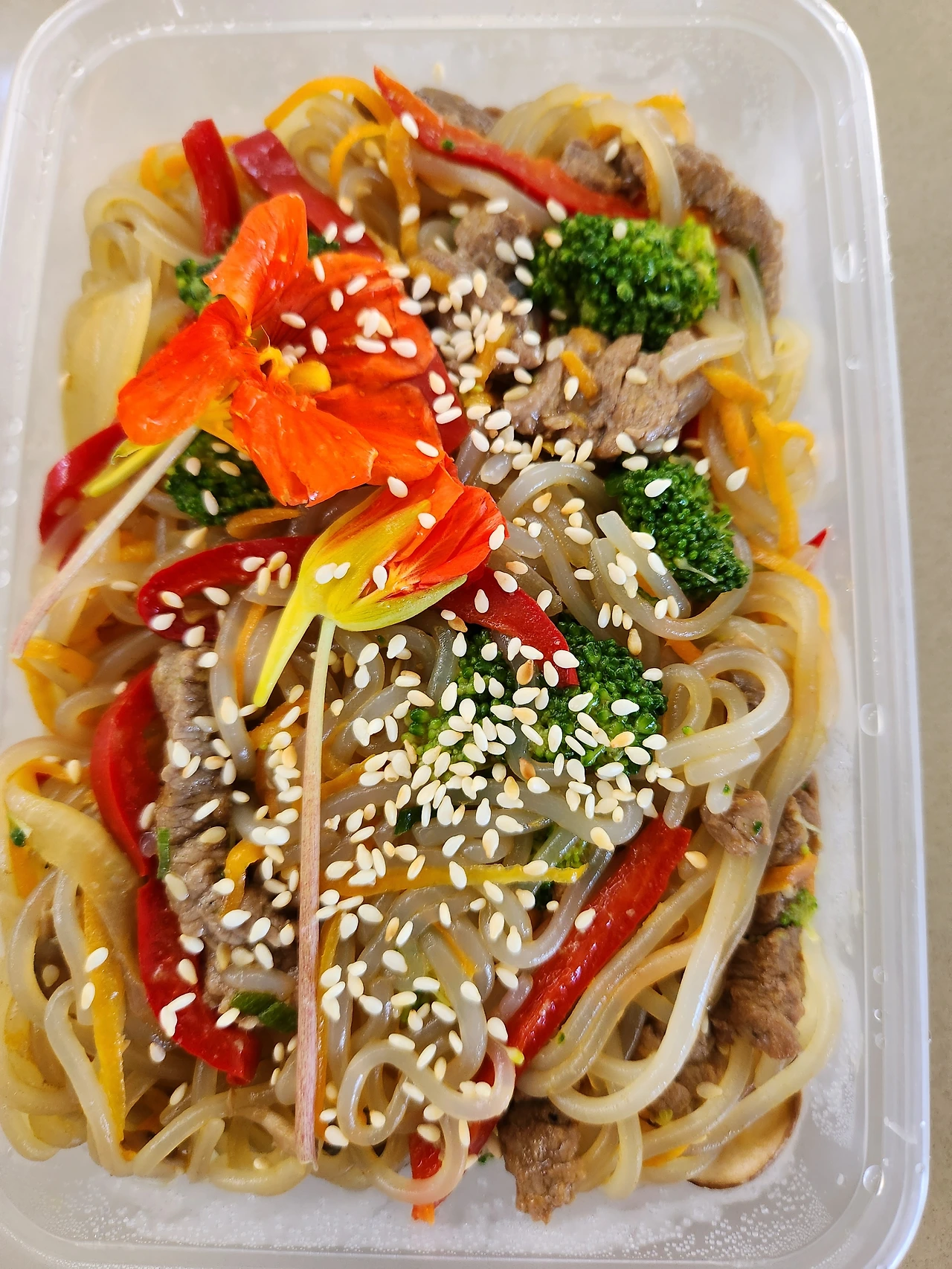 난 그녀에게 크리스마스 카드를 쓰고, 코리언 대표푸드, 잡채를 정성스럽게 쿡했다. 당근, 양파, 버섯, 파프리카를 최대한 가지런하게 채 썰고, 브로콜리를 초록색이 명징하도록 삶아내었다. 불고기는 달짝 짭짤하게 미리 양념을 해두었다. 뜨겁게 달궈진 웍에다 하얀색 양파부터 시작하여 붉은색 파프리카까지, 차례대로 지지직 달달달 볶아내었다. 참기름 솔솔솔 뿌리고 20인분을 거뜬히 무쳐내었다. 그녀, 선생 린의 잡채를 따로 한 팩, 한련화로 장식을 하여서 정성 들여 담았다. 마침, 오늘은 블랭킷 바디스에 뜨개질한 것을 갖다주고 털실을 갖고 오는 날이어서, 아침부터 분주하게 움직여야 했다.