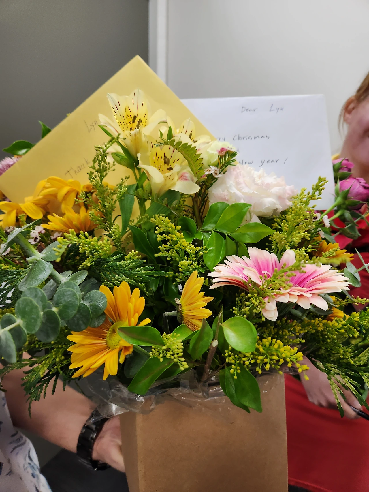 그녀는 오늘 아침, 떠나갈 선생 린에게 전달할 카드와 꽃바구니를 준비하여 학교에 왔다. 그런데 뉴 이어의 뉴 티처, 질이 같이 앉아 있어서, 그녀는 얼른 타운으로 운전하여 돌아가 또 하나의 꽃다발과 카드를 사 왔다. 아뿔싸, 하지만 비기너 클래스 남자선생, 이안까지 와 있더란다. 통 큰 그녀, 부랴부랴 다시 가서 꽃과 카드를 사 왔다니, 그녀의 뜨거운 정성에 내가 다 고마웠다. 그녀, 이번엔 발론티어 코렐 선생거까지 샀다니.