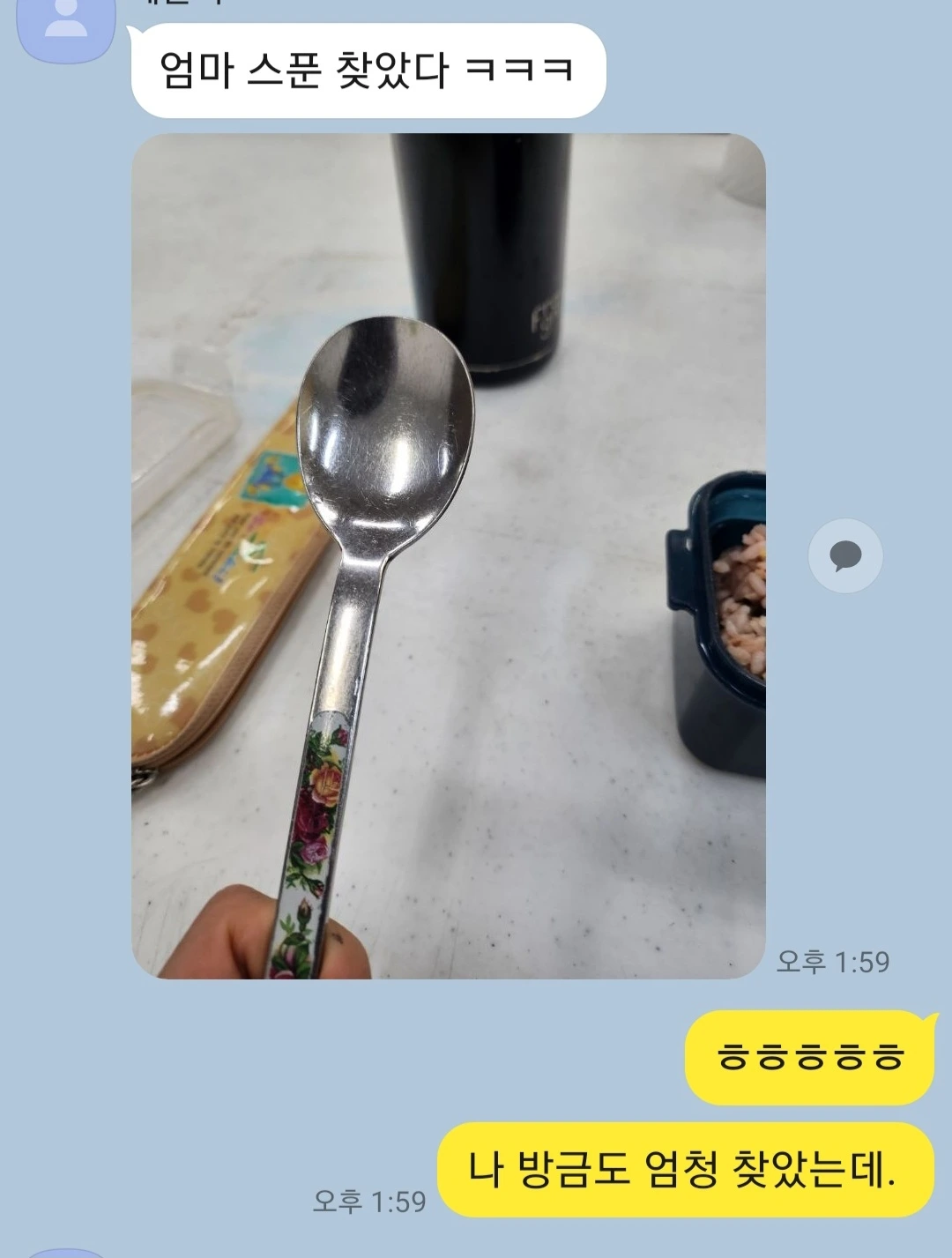 몇 년 전 한국 갔을 때 엘백화점 6층을 샅샅이 살피어 어렵사리 간택하여 데려온 숟갈인데. 바늘도 아닌 것이 어디메쯤 숨었는지 도통 찾을 수가 없었다. 아침은 다른 숟갈을 사용하여 먹었다. 점심때가 되었다. 온 정지깐을 다, 이 잡듯이 뒤집어봐도 내 숟갈을 찾지 못하였다. 또 다른 숟갈로 밥을 먹고 있는데 일터로 나간 딸한테서 카톡이 왔다.