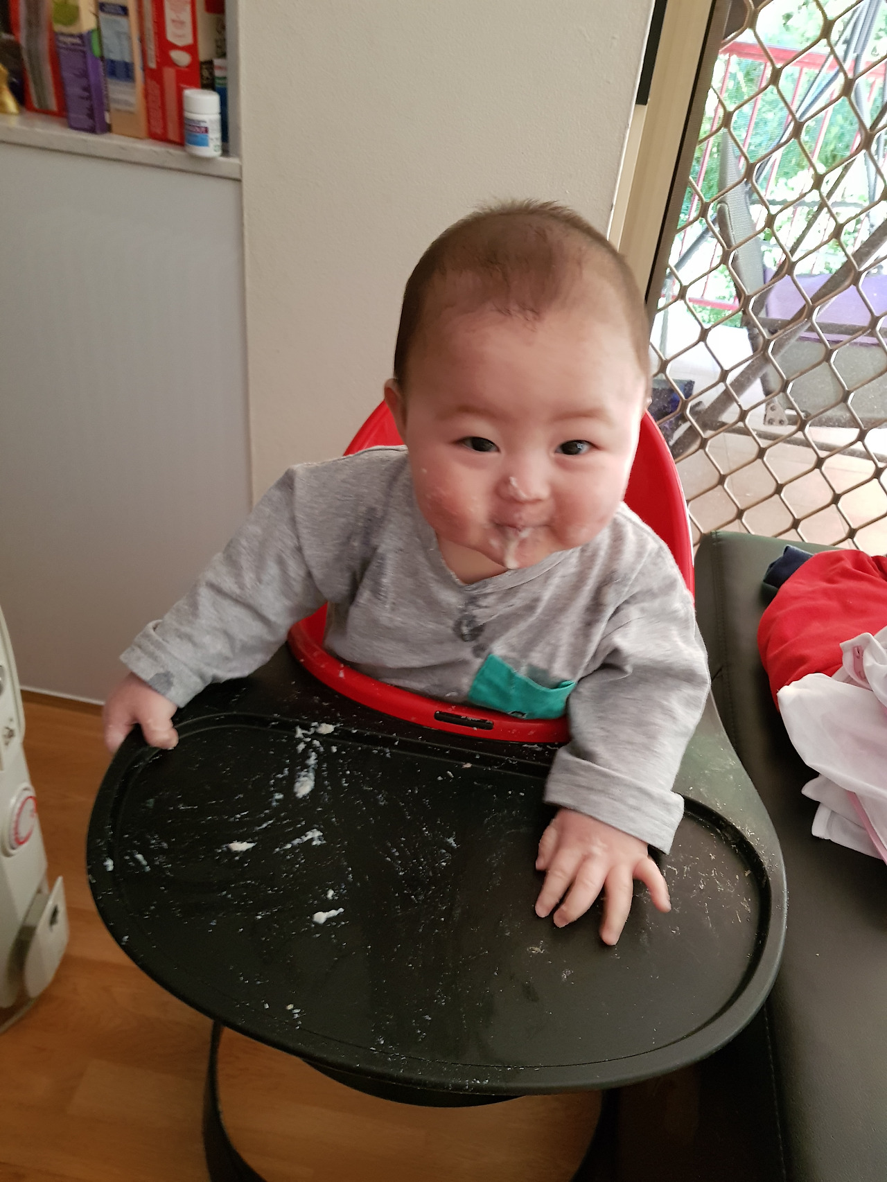 서울에 사는 재영이 할머니한테 사진과 동영상을 보냈더니, "아이고, 재영이 이유식 묻힌 입이 더 귀엽고 이뻐요." 하신다.
