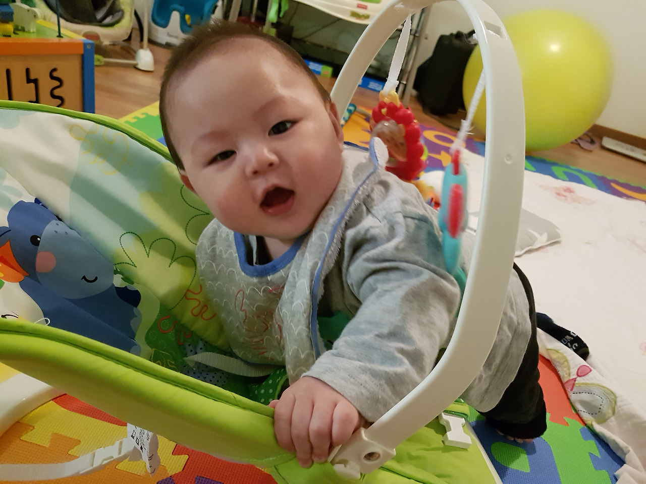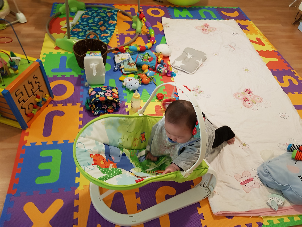 이렇게 거실이 재영이의 굳 플래이 그라운드로 확 바뀌었고, 그날 저녁부터 7개월짜리 재영인 아기 침대로 다시 독립했다.