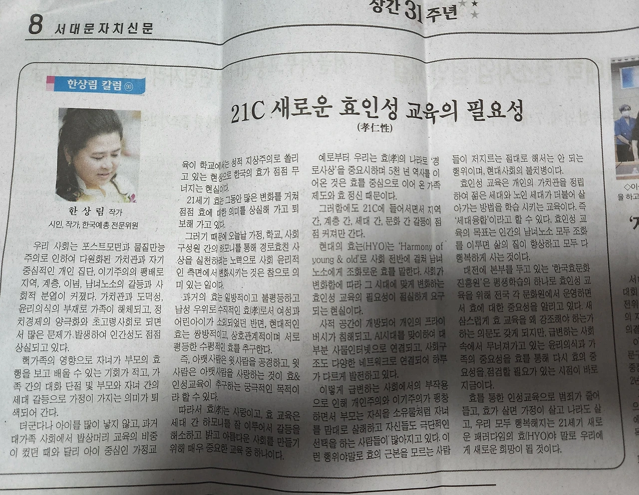 한국은 예로부터 효(孝)의 나라로 ‘경로사상’을 중요시하였다. 우리의 전통의 효는 한국 고유의 정신문화이다. 우리나라 5천 년 역사를 이어온 것은 가족제도와 효 정신 때문이었다. 그러함에도 21C에 들어서면서 지역 간, 계층 간, 세대 간, 문화 간 갈등이 점점 커져만 간다. 따라서 효孝=하모니(Hormony), 즉 사회 전반에 걸쳐 조화로운 효 교육의 필요성이 매우 절실한 현실이다.