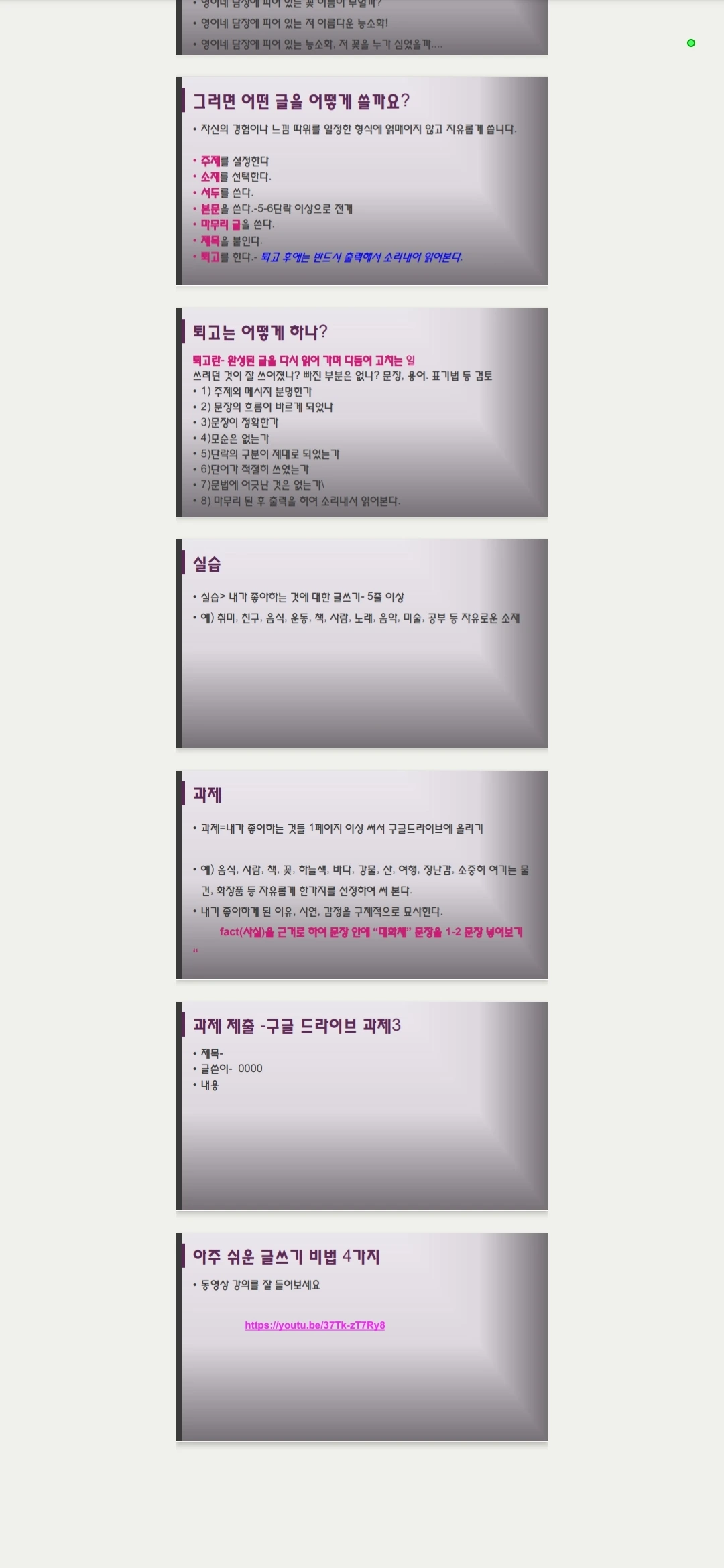 실습은 그날 강의한 내용에 맞춰서 주제를 주고 문장을 채팅 창으로 써서 올리면 한 사람 한 사람 피드백으로 설명을 해주는 거다. 그리고 그 내용을 다시 과제로 제출하는 방식인데, 과제는 구글 드라이브에 본인이 직접 올리고, 거기서 강사가 일일이 수정하여서 퇴고 과정을 설명해 준다.