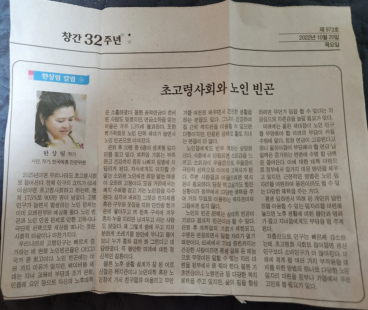2025년이면 우리나라도 초고령사회로 들어선다. 전체 인구의 20%가 65세 이상이면 초고령사회라고 하는데, 현재 17.5%로 900만 명이 넘었다. 고령인구가 늘면서 발생하는 노인 문제는 이미 오래전부터 예상해 왔다. 노인 빈곤과 노인 인권 문제로 인한 고독사나 극단적 선택으로 세상을 떠나는 것은 사회적 타살이나 마찬가지다.