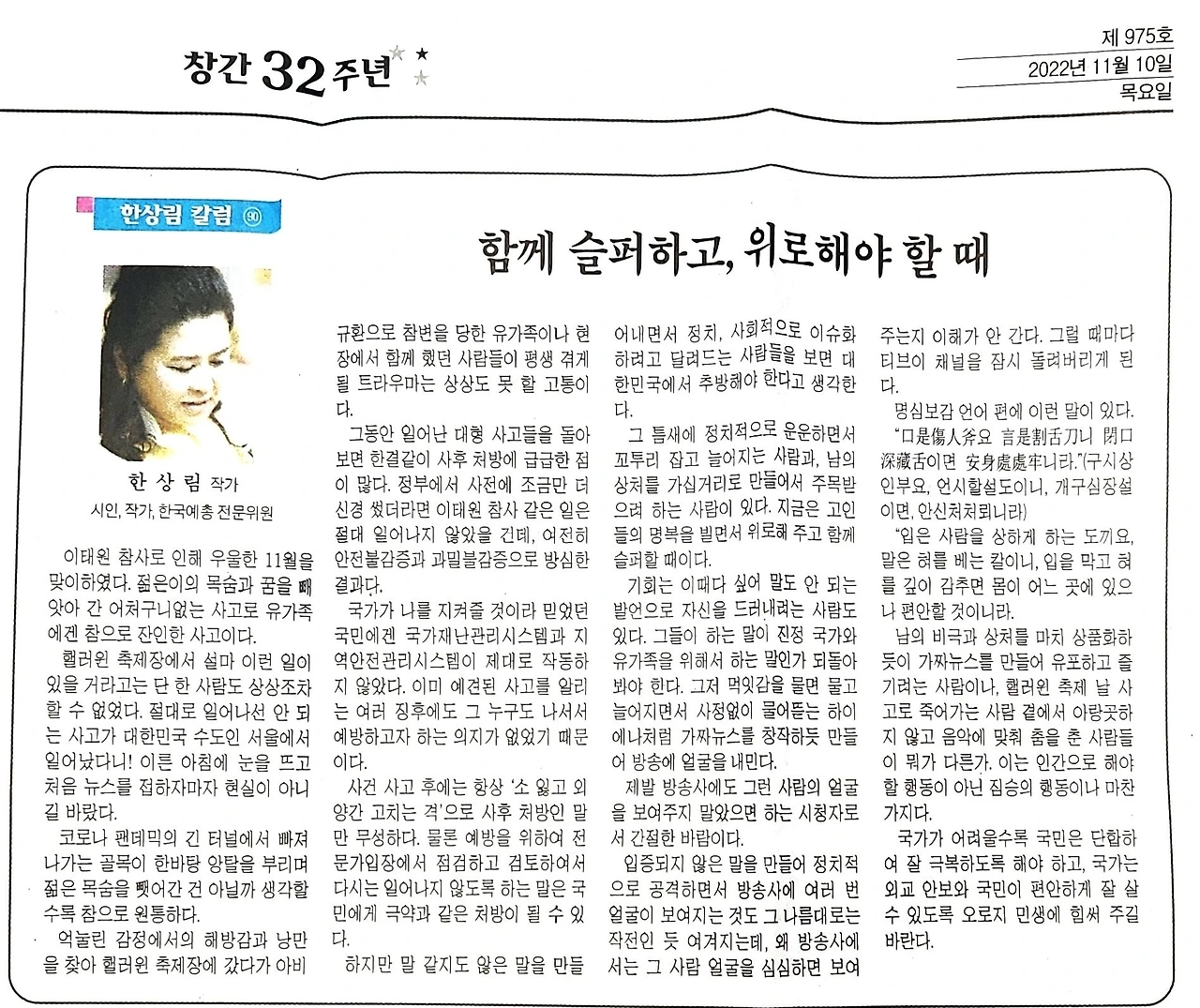 코로나 팬데믹의 긴 터널에서 빠져나가는 골목이 한바탕 앙탈을 부리며 젊은 목숨을 뺏어간 건 아닐까 생각할수록 참으로 원통하다. 억눌린 감정에서의 해방감과 낭만을 찾아 핼러윈 축제장에 갔다가 아비규환으로 참변을 당한 유가족이나 현장에서 함께 했던 사람들이 평생 겪게 될 트라우마는 상상도 못 할 고통이다.