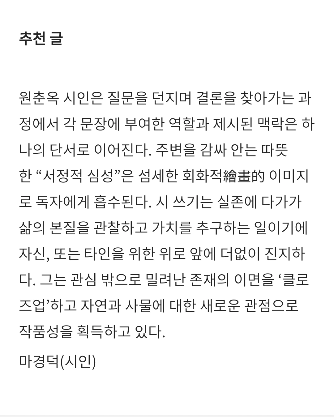 원 춘 옥 밥상에 앉은 다혈질 남자가 버럭 소리를 지른다 숨 죽 은 콩나물처럼, 시금치처럼 여자는 “할 말은 많으나 이만 줄임”이라고 눈으로 쓴다 밥상에 앉은 남자가 여자를 쏘아본다 여자는 묵묵히 사골 찜솥을 준비한다 국물만 고아내면 서로의 간도 맞는 맞춤형이 되겠지 남자는 양푼 가득 마늘을 담아와 까기 시작한다 매운 냄새가 서로의 관계처럼 자극적이다 남자도 “할 말은 많으나 이만 줄임” 집안 분위기로 쓴다 누가 초식형이었는지 누가 육식형이었는지 알 수 없는 두 사람 사이에 깐 마늘만 수북이 쌓 여가는
