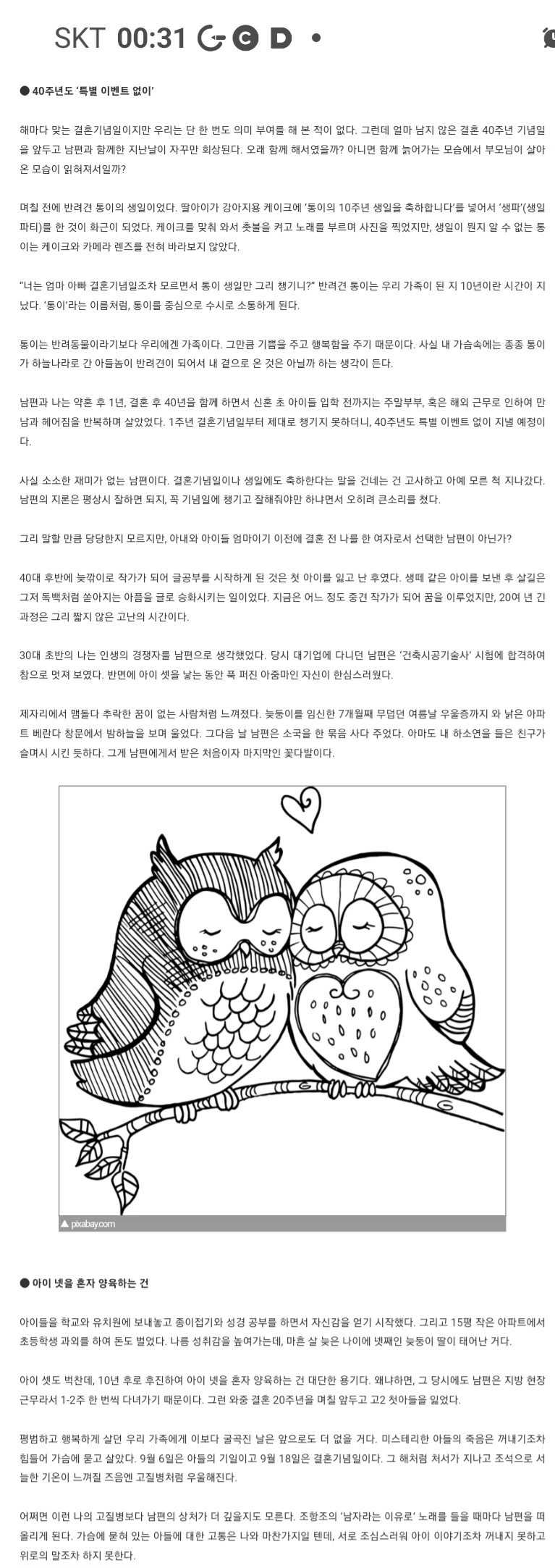 조항조의 ‘남자라는 이유로’ 노래를 들을 때마다 남편을 떠올리게 된다. 가슴에 묻혀 있는 아들에 대한 고통은 나와 마찬가지일 텐데, 서로 조심스러워 아이 이야기조차 꺼내지 못하고 위로의 말조차 하지 못한다.