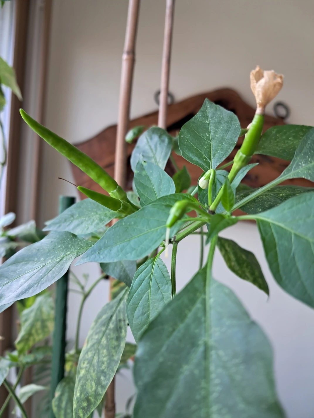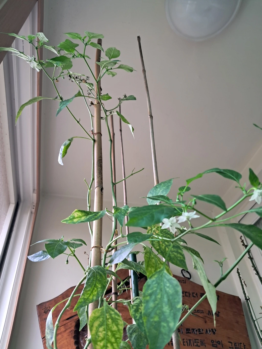 고추를 화분에 심은 지 6년이 지났다는데도 여전히 고추꽃을 피우고 열매를 맺는다.
