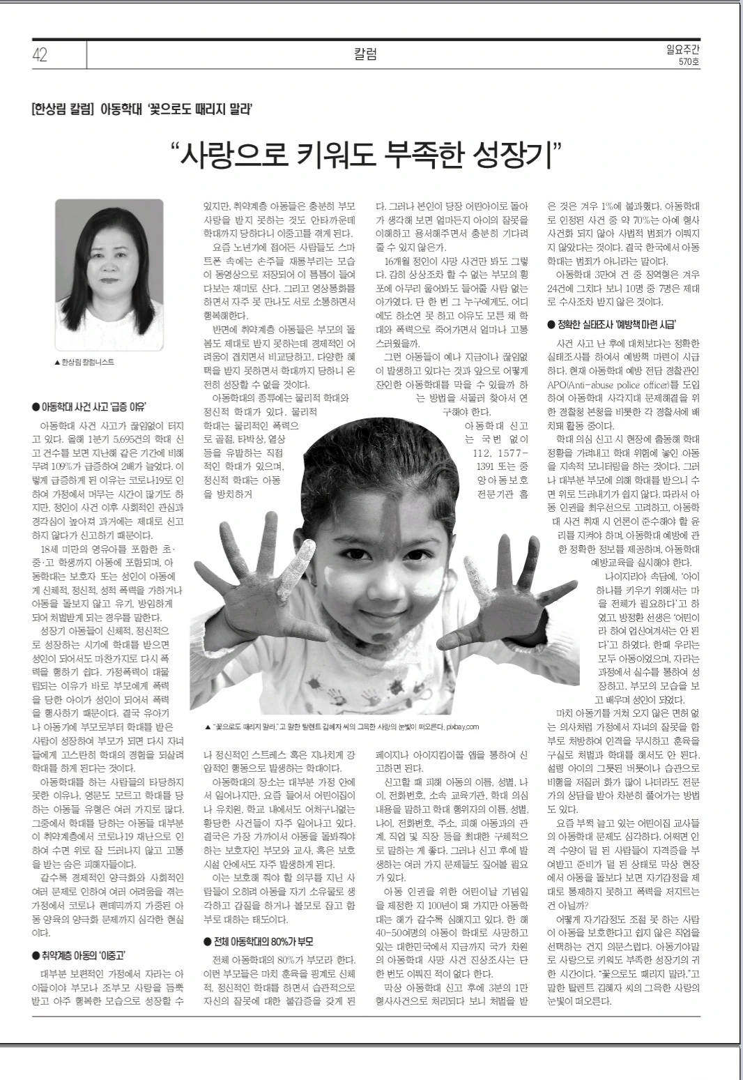 아동학대 사건 사고가 끊임없이 터지고 있다. 올해 1분기 5,695건의 학대 신고 건수를 보면 지난해 같은 기간에 비해 무려 109%가 급증하여 2배가 늘었다. 이렇게 급증하게 된 이유는 코로나 19로 인하여 가정에서 머무는 시간이 많기도 하지만, 정인이 사건 이후 사회적인 관심과 경각심이 높아져 과거에는 제대로 신고하지 않다가 신고하기 때문이다.