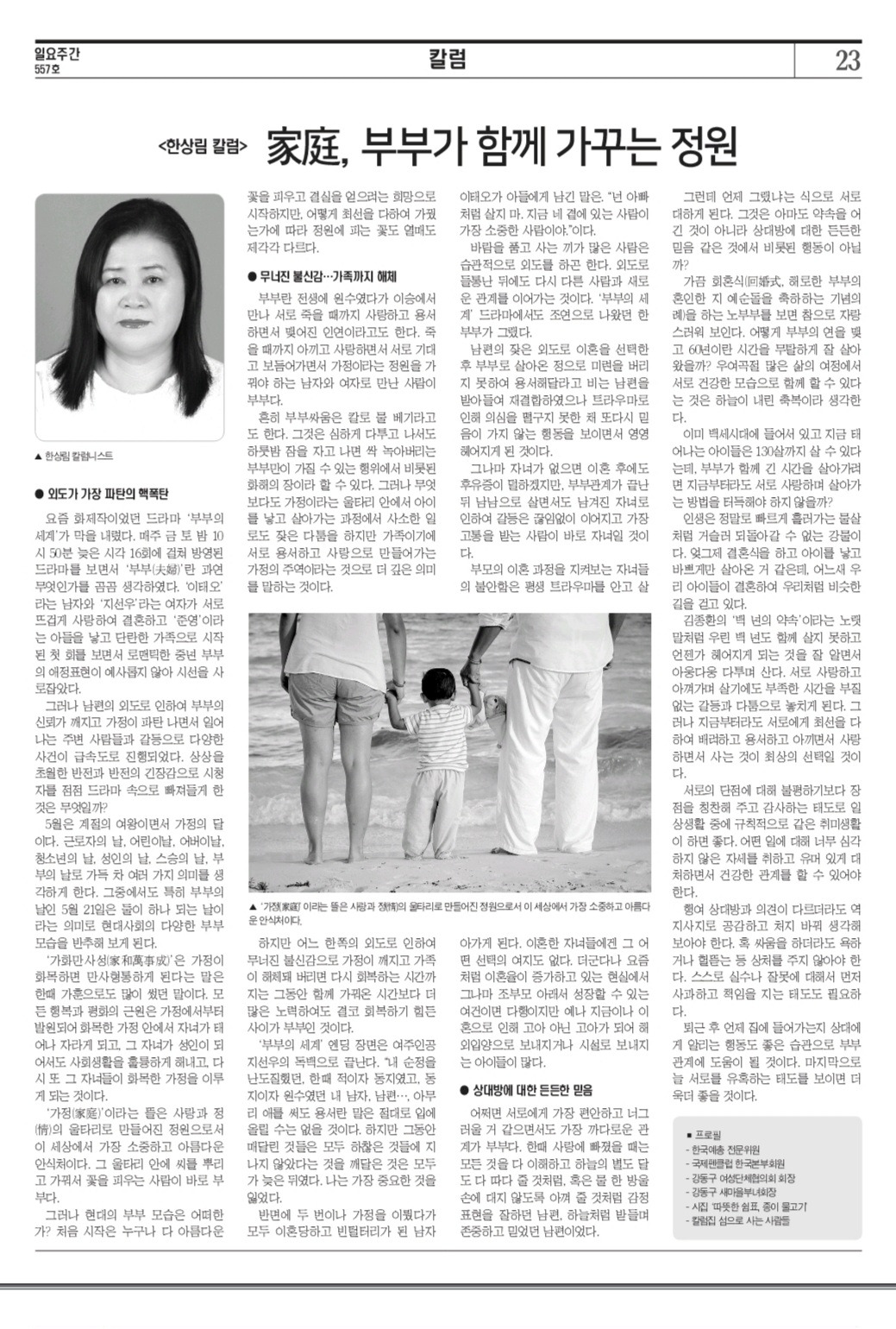 5월은 계절의 여왕이면서 가정의 달이다. 근로자의 날, 어린이날, 어버이날, 청소년의 날, 성인의 날, 스승의 날, 부부의 날로 가득 차 여러 가지 의미를 생각하게 한다. 그중에서도 특히 부부의 날인 5월 21일은 둘이 하나 되는 날이라는 의미로 현대사회의 다양한 부부 모습을 반추해 보게 된다.
