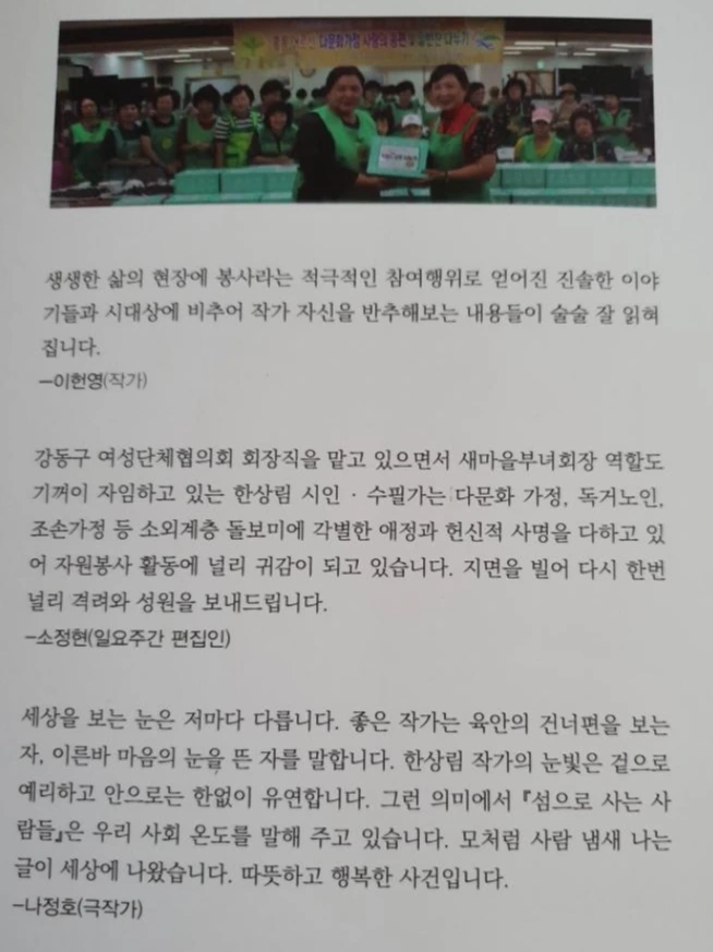 요즘 들어 정현종 시인이 노래한 ‘섬’이라는 시구가 뇌리에서 맴돈다. ‘사람들 사이에 섬이 있다. 그 섬에 가고 싶다’ 생각해 보면 우리 모두 하나하나의 섬으로 존재하는 외롭고 나약한 생명체다. 섬과 섬을 이어주는 것은 사랑과 관심뿐이다. 이 순간에도 어디선가 홀로 죽어가고 있는 사람이 있다.
