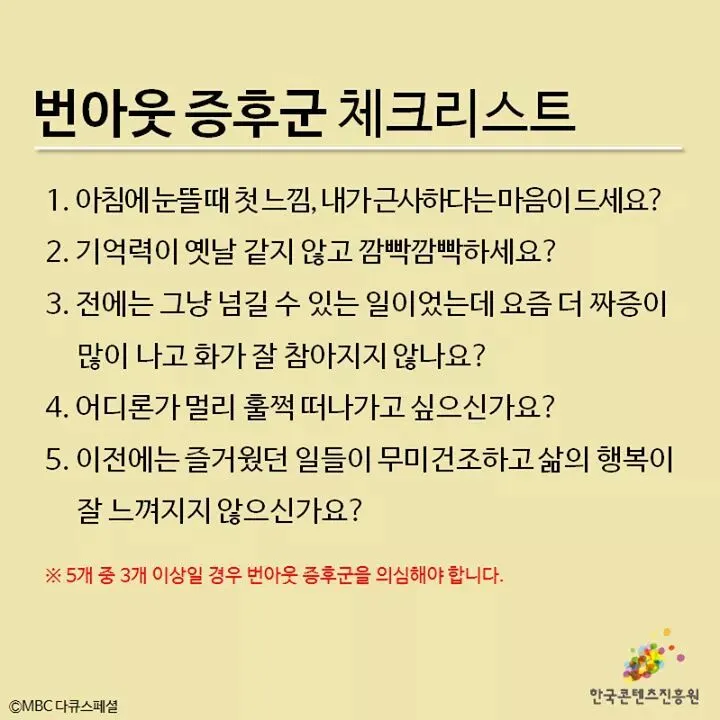 '번아웃(Burn Out)'은 글자 그대로 에너지를 모두 소진하고 어느 순간 무기력과 심리적인 허기를 느끼는 상태를 말한다. 몸에 특별한 이상이나 질병이 없음에도 불구하고 갑자기 세상만사가 귀찮아지고 무기력해지는 증상이다. 단순한 무기력증만 아니라 집중력이 부족하고, 우울증·두통·요통 등 다양한 질환을 유발하고 수면장애와 대인기피증 등 심각한 문제를 초래할 수 있다.