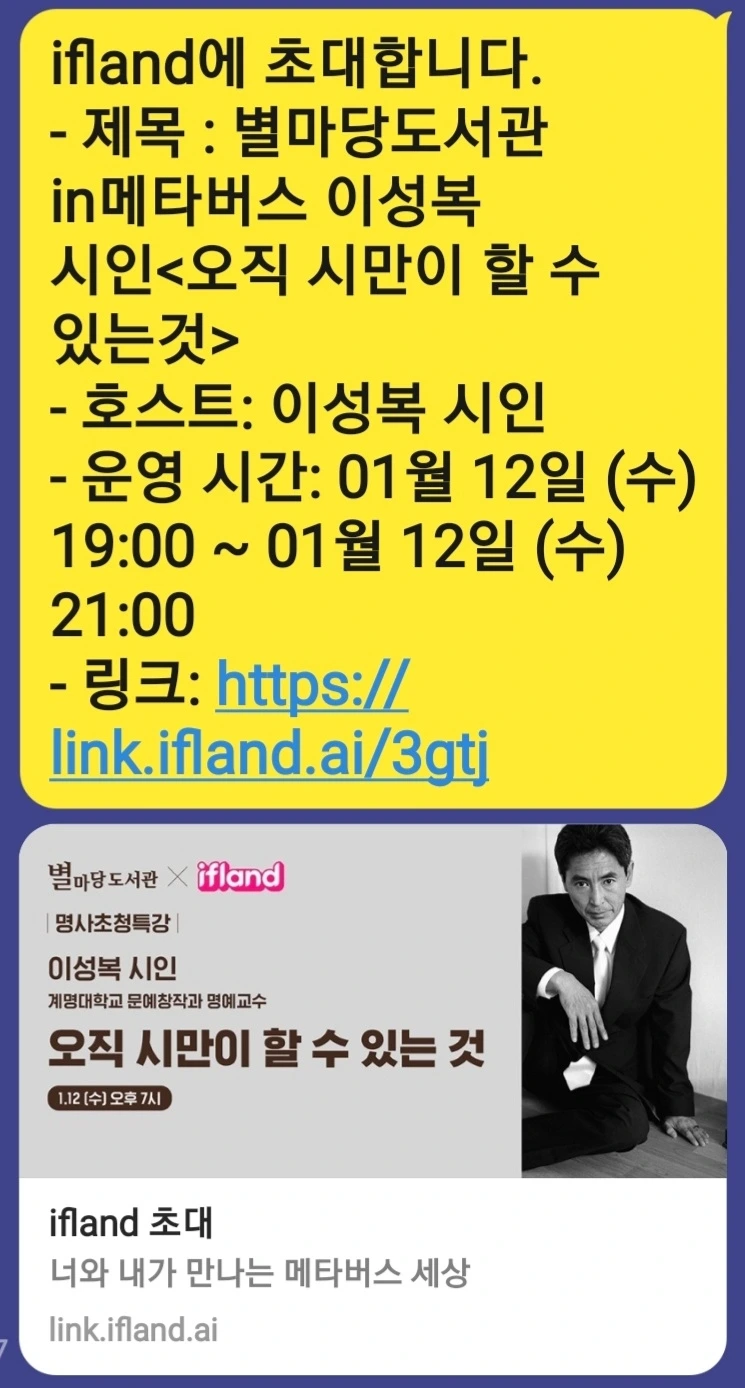 호스트가 보내준 초대장이다. 알림을 설정 해 놓으면 알림이 울려 그때 링크를 클릭하여 입장하면 된다.오늘은 ifland <별마당 도서관>에서 이성복 시인님의 강의를 처음으로 이프랜드에 입장하여 들었다.